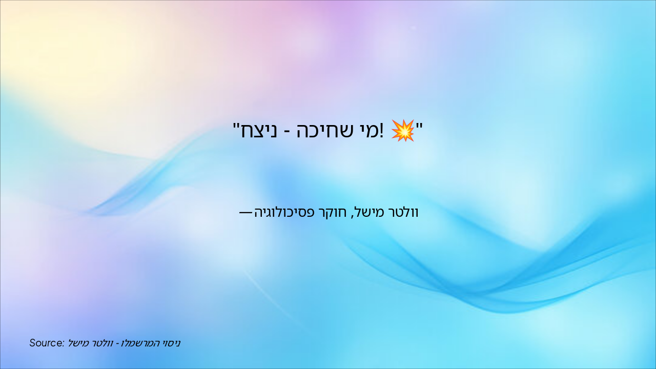 ניסוי וולטר מישל גילה שהילדים שחיכו להנאה מאוחרת הצליחו יותר בבגרות עם ציונים גבוהים וקריירה מצוינת. חיכוי שווה להצלחה ארוכת טווח, והשקופית מציעה חידה על זמן ההמתנה האישי.