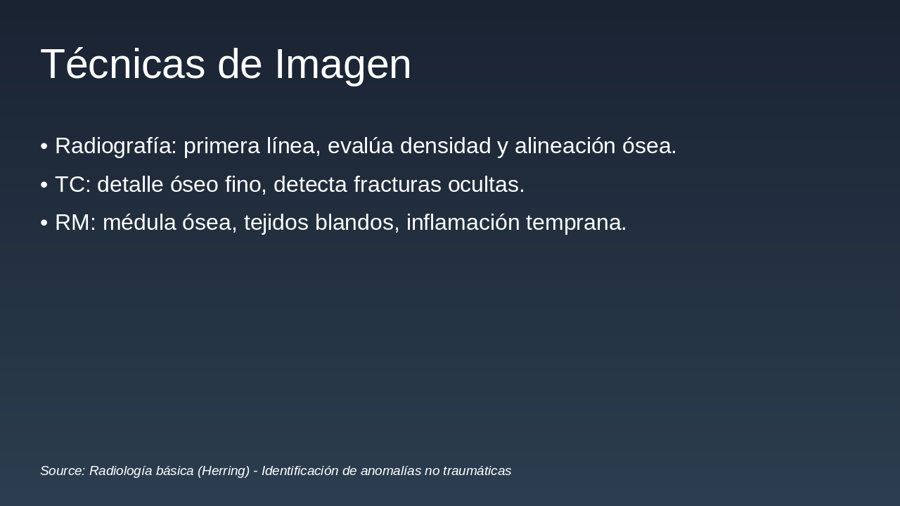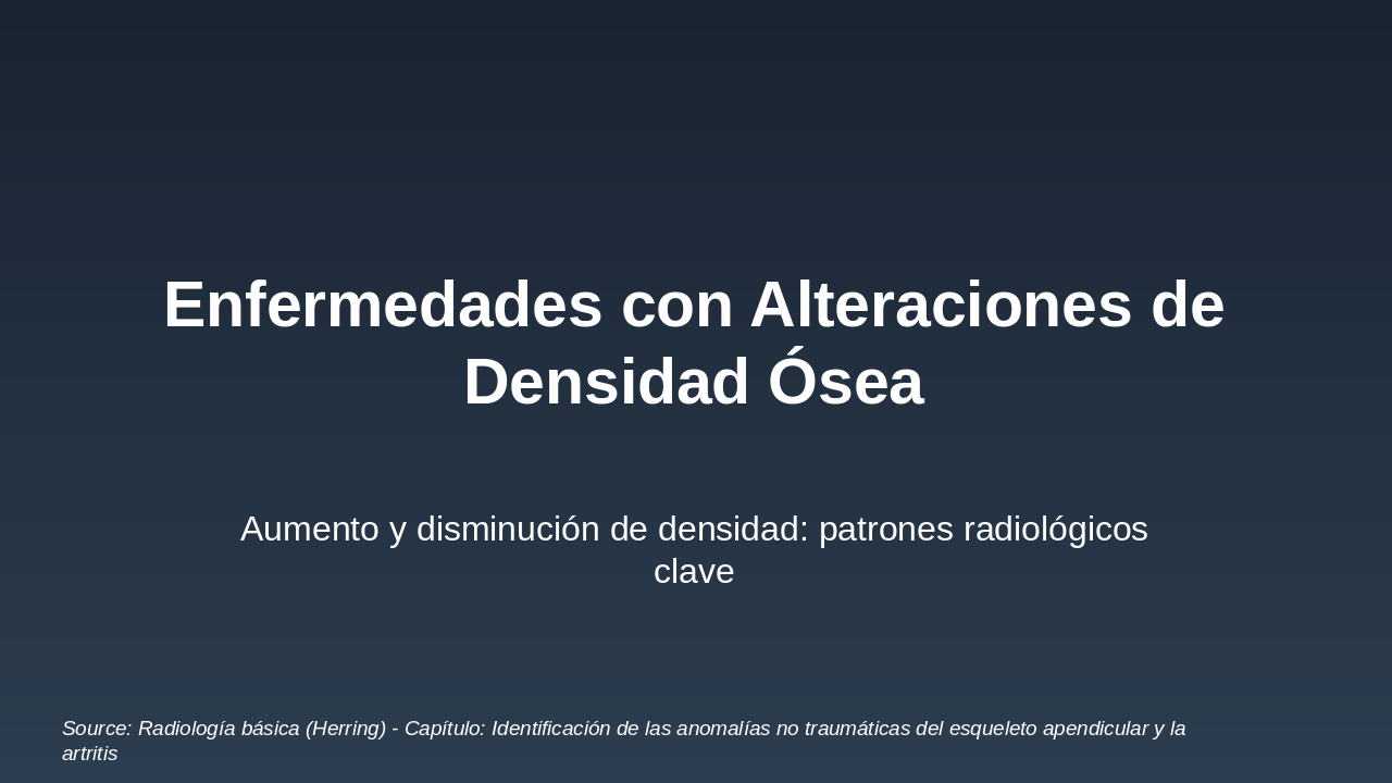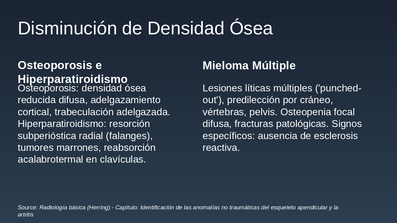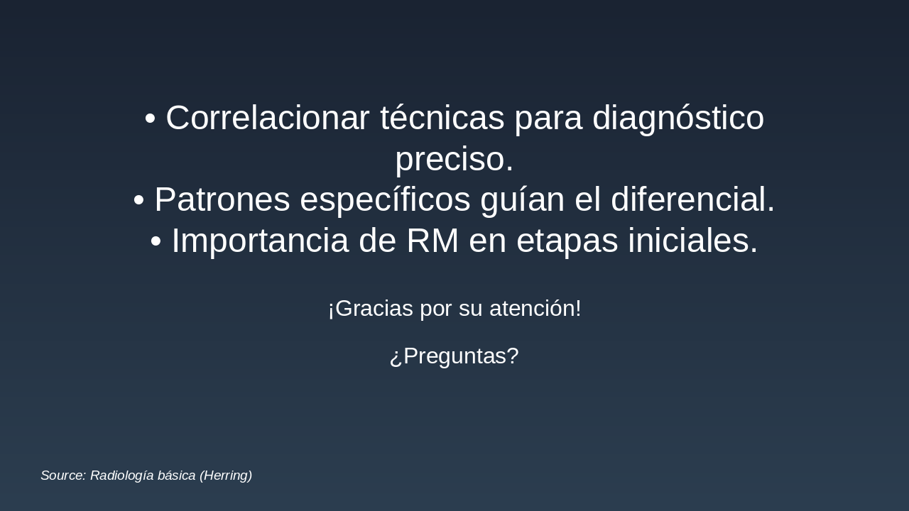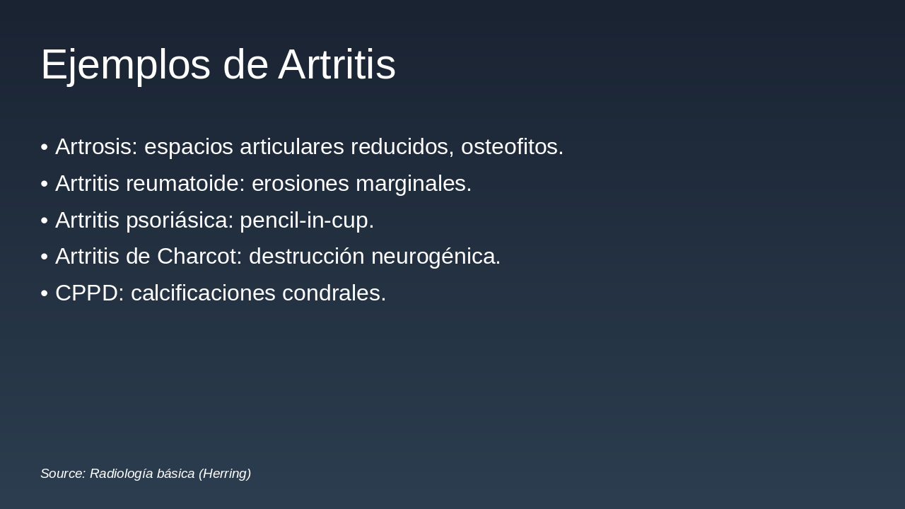 Resumen de hallazgos clave y consideraciones diagnósticas. Source: Capítulo 'Identificación de las anomalías no traumáticas del esqueleto apendicular y la artritis' del libro Radiología básica (Herring)