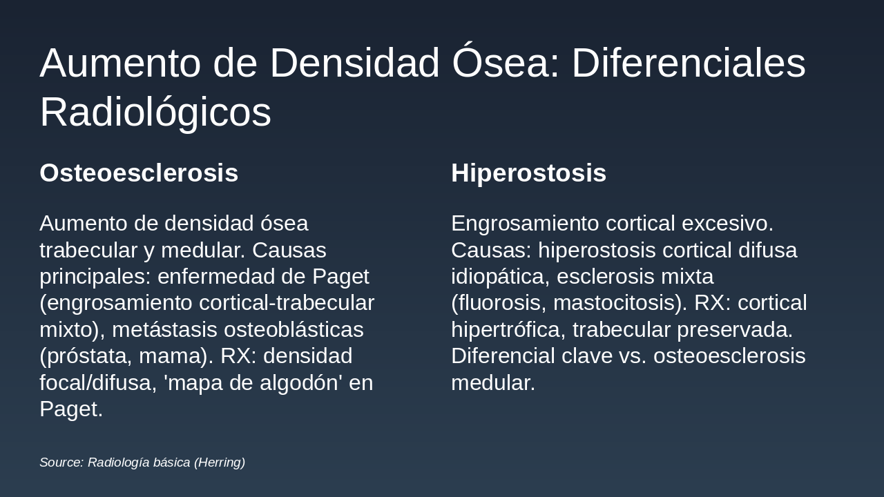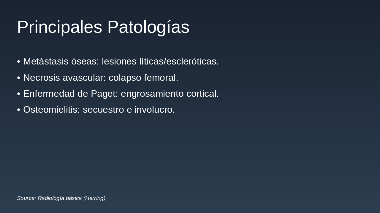 Aumento/disminución de densidad; metástasis, Paget, osteoporosis, etc.