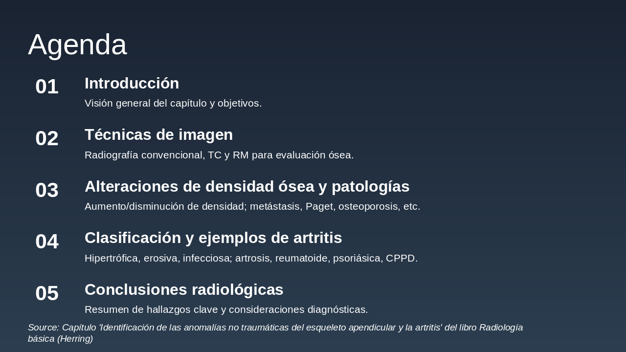 This agenda slide outlines a chapter introduction with objectives, imaging techniques (conventional radiography, CT, and MRI for bone evaluation), and bone density alterations plus pathologies like metastases, Paget's disease, and osteoporosis. It continues with arthritis classifications (hypertrophic, erosive, infectious) including examples like osteoarthritis, rheumatoid, psoriatic, and CPPD, ending with key radiological conclusions.