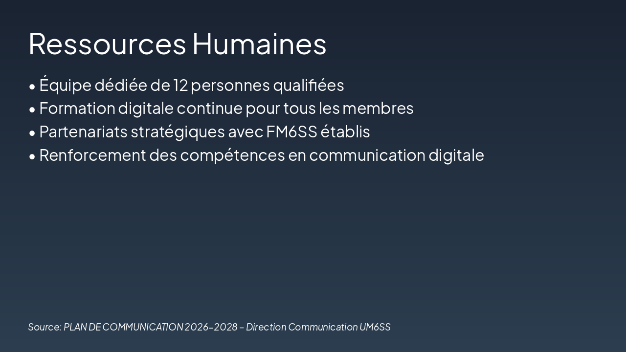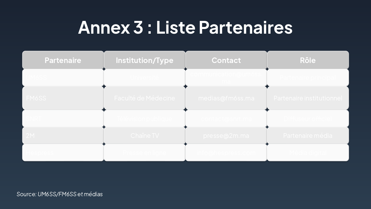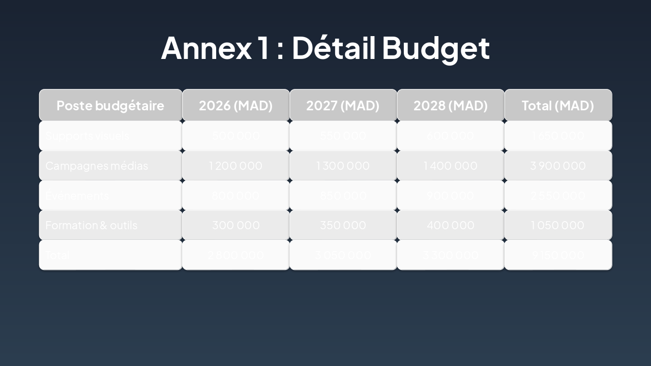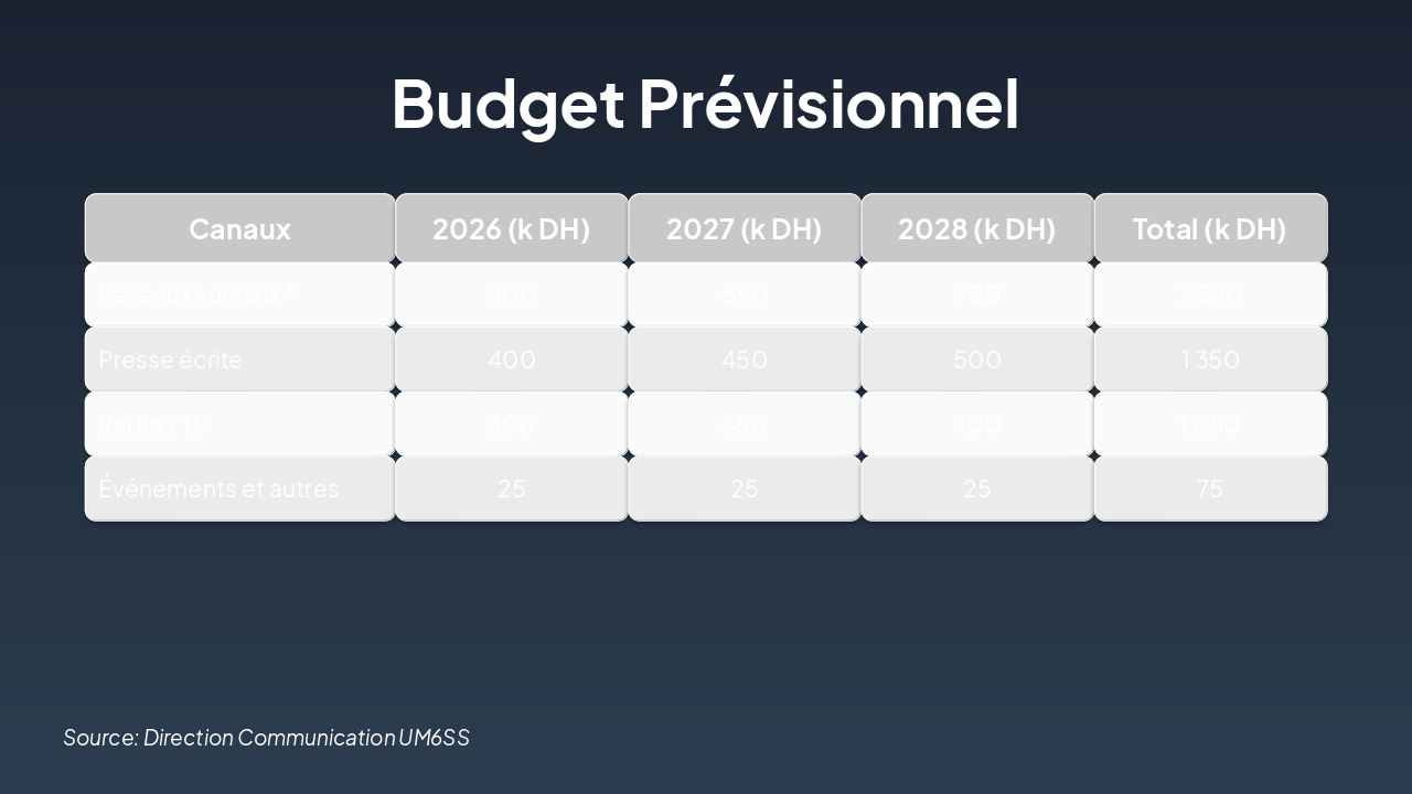 { "headers": [ "Canaux", "2026 (k DH)", "2027 (k DH)", "2028 (k DH)", "Total (k DH)" ], "rows": [ [ "Réseaux sociaux ", "800", "850", "900", "2 550" ], [ "Presse écrite", "400", "450", "500", "1 350" ], [ "Radio / TV", "300", "350", "400", "1 050" ], [ "Événements et autres", "25", "25", "25", "75" ] ] }