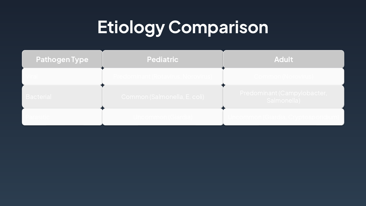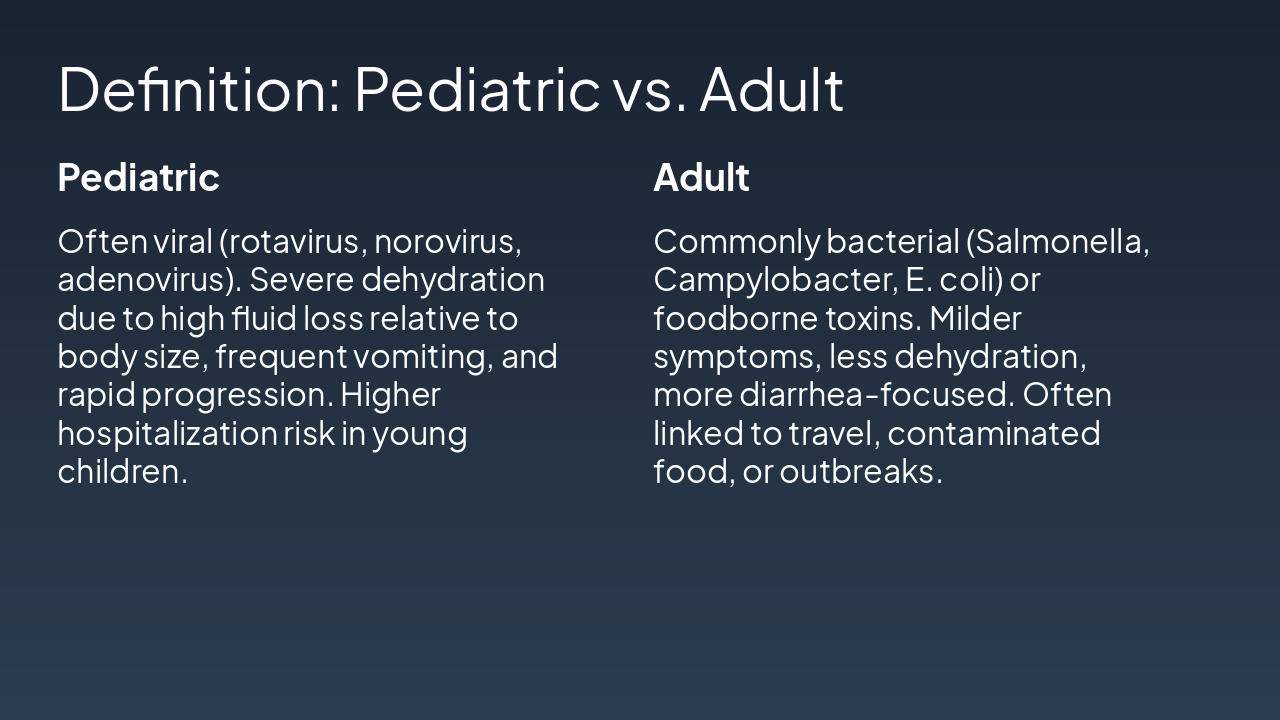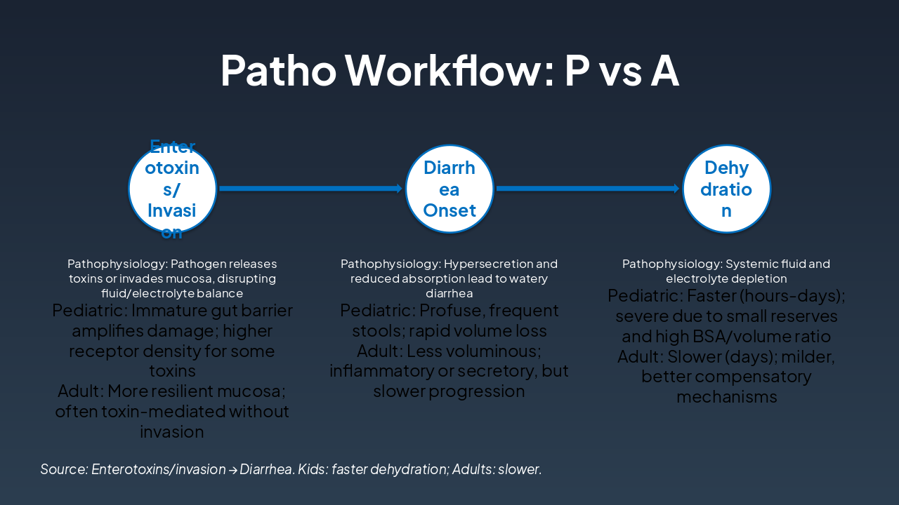 { "headers": [ "Phase", "Pathophysiology", "Pediatric", "Adult" ], "rows": [ [ "Enterotoxins/Invasion", "Pathogen releases toxins or invades mucosa, disrupting fluid/electrolyte balance", "Immature gut barrier amplifies damage; higher receptor density for some toxins", "More resilient mucosa; often toxin-mediated without invasion" ], [ "Diarrhea Onset", "Hypersecretion and reduced absorption lead to watery diarrhea", "Profuse, frequent stools; rapid volume loss", "Less voluminous; inflammatory or secretory, but slower progression" ], [ "Dehydration", "Systemic fluid and electrolyte depletion", "Faster (hours-days); severe due to small reserves and high BSA/volume ratio", "Slower (days); milder, better compensatory mechanisms" ] ] }