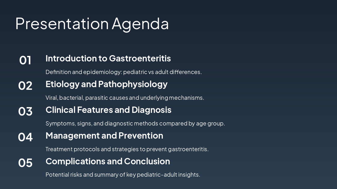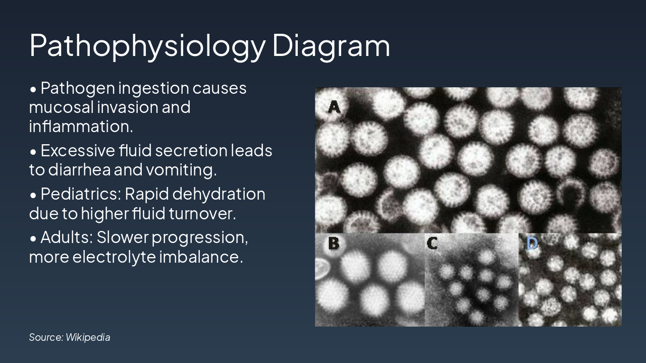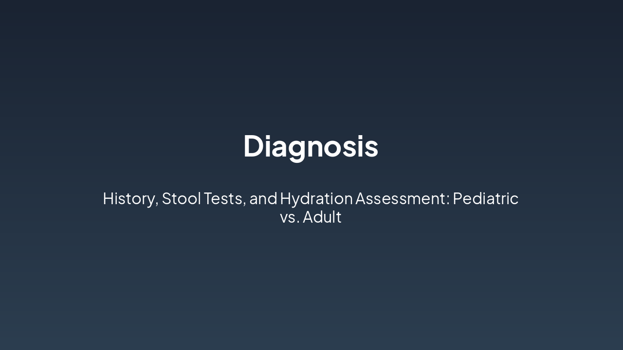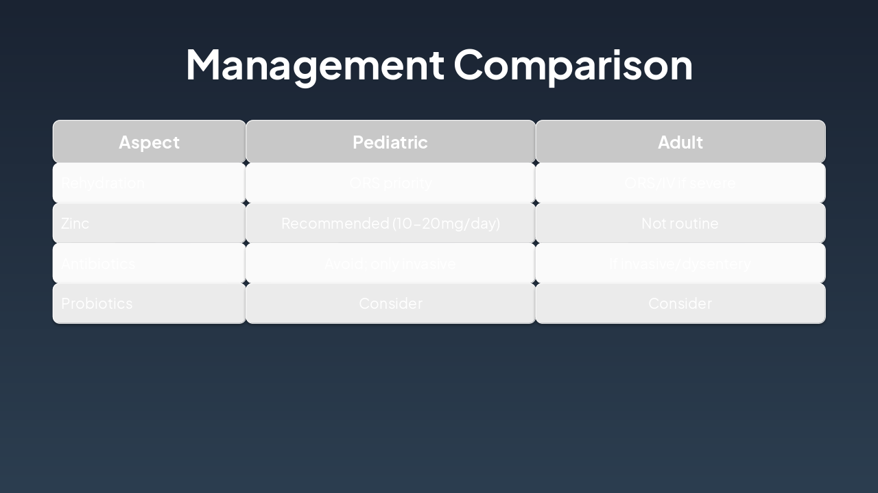 { "headers": [ "Phase", "Pathophysiology", "Pediatric", "Adult" ], "rows": [ [ "Enterotoxins/Invasion", "Pathogen releases toxins or invades mucosa, disrupting fluid/electrolyte balance", "Immature gut barrier amplifies damage; higher receptor density for some toxins", "More resilient mucosa; often toxin-mediated without invasion" ], [ "Diarrhea Onset", "Hypersecretion and reduced absorption lead to watery diarrhea", "Profuse, frequent stools; rapid volume loss", "Less voluminous; inflammatory or secretory, but slower progression" ], [ "Dehydration", "Systemic fluid and electrolyte depletion", "Faster (hours-days); severe due to small reserves and high BSA/volume ratio", "Slower (days); milder, better compensatory mechanisms" ] ] }