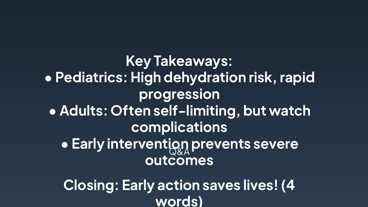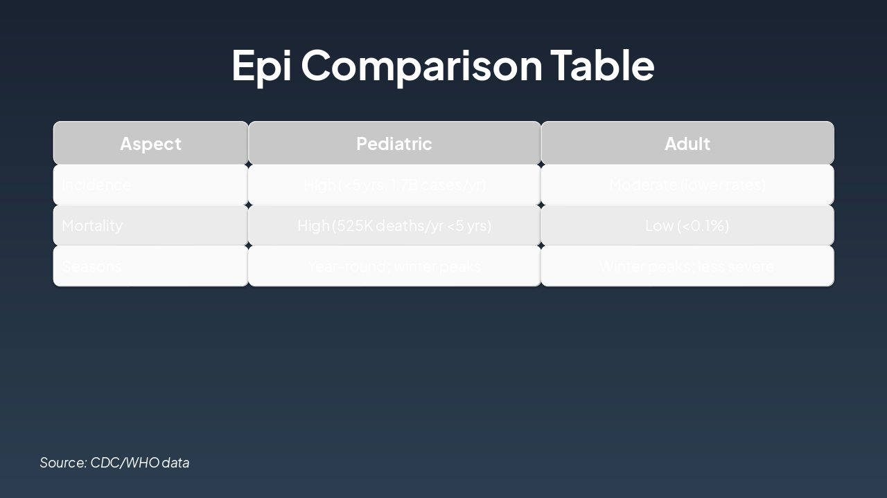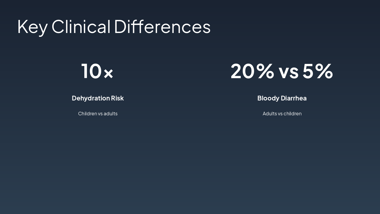 This slide compares the pathophysiology workflow of pathogen-induced diarrhea (enterotoxins/invasion to dehydration) between pediatric and adult patients. Pediatrics shows amplified damage from immature guts, leading to profuse watery diarrhea and rapid severe dehydration, while adults exhibit resilient mucosa, slower progression, and milder symptoms.
