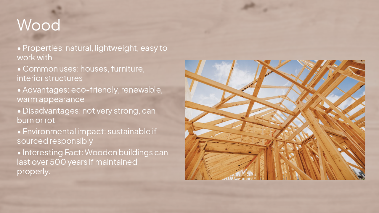 Slide 1 – Title Construction Materials Properties, Uses and Environmental Impact 🎨 Design: • Фон: колаж будівель (мости + хмарочоси + дорога) • Стиль: мінімалістичний індустріальний (сірий + синій) • Великий напівпрозорий текст по центру ✨ Додатково: • Підзаголовок: “What our modern world is built from” ⸻ Slide 2 – Introduction Construction materials are essential in civil engineering and architecture. Different materials are used depending on the type of building, its purpose, strength requirements, and environmental conditions. 🎨 Design: • Іконки: 🏗️ 🏢 🌉 🏠 • Фон: схема міста або blueprint (креслення) ✨ Цікавий факт: • Today, humans use over 10 billion tons of construction materials per year. ⸻ Slide 3 – Concrete Properties: strong, durable, heavy, fire-resistant Common uses: foundations, bridges, roads, buildings Advantages: very strong, long-lasting, affordable Disadvantages: high CO₂ emissions during production, heavy weight Environmental impact: production causes pollution, but it is widely used due to durability 🎨 Design: • Фото: будівництво моста або заливка бетону • Колір: сірий + темно-синій ✨ Цікавий факт: • Concrete is the second most used material on Earth after water. ⸻ Slide 4 – Steel Properties: strong, flexible, recyclable Common uses: skyscrapers, bridges, frameworks Advantages: high strength, flexible, reusable Disadvantages: expensive, can rust without protection Environmental impact: recyclable but energy-intensive to produce 🎨 Design: • Фото: хмарочис з металевим каркасом • Ефект: блиск металу ✨ Цікавий факт: • Steel can be recycled 100% without losing strength. ⸻ Slide 5 – Wood Properties: natural, lightweight, easy to work with Common uses: houses, furniture, interior structures Advantages: eco-friendly, renewable, warm appearance Disadvantages: not very strong, can burn or rot Environmental impact: sustainable if sourced responsibly 🎨 Design: • Фон: текстура дерева • Теплі кольори (коричневий, зелений) ✨ Цікавий факт: • Wooden buildings can last over 500 years if maintained properly. ⸻ Slide 6 – Brick Properties: strong, durable, good insulation Common uses: walls, residential buildings Advantages: long lifespan, good thermal insulation Disadvantages: heavy, slow construction process Environmental impact: relatively low, but firing bricks uses energy 🎨 Design: • Фон: цегляна стіна • Червоний + оранжевий стиль ✨ Цікавий факт: • The oldest bricks are over 7,000 years old. ⸻ Slide 7 – Glass Properties: transparent, fragile but strong when treated Common uses: windows, facades, modern buildings Advantages: allows natural light, aesthetic design Disadvantages: breakable, low insulation Environmental impact: recyclable but energy needed for production 🎨 Design: • Скляні хмарочоси, відбиття неба • Ефект прозорості ✨ Цікавий факт: • Special glass can now be bulletproof or self-cleaning. ⸻ Slide 8 – Asphalt Properties: smooth, waterproof, flexible Common uses: roads, highways, pavements Advantages: cheap, fast to apply, durable for roads Disadvantages: heats up, not eco-friendly Environmental impact: petroleum-based, contributes to pollution 🎨 Design: • Фото дороги з висоти • Темний фон + жовті лінії ✨ Цікавий факт: • Asphalt roads can melt slightly in extreme heat. ⸻ Slide 9 – Comparison All materials have different roles in construction. Engineers choose materials based on strength, cost, durability, and environmental impact. 🎨 Design: • Таблиця або діаграма (іконки матеріалів) • Мінімалістичний білий фон ✨ Додатково: • Best material = depends on the project, not “one perfect choice” ⸻ Slide 10 – Conclusion Modern construction depends on a combination of materials. The best choice depends on balancing strength, cost, and sustainability. 🎨 Design: • Фото сучасного міста • Світлий, “майбутній” стиль ✨ Фінальна фраза (дуже гарна для оцінки): • “The future of construction is sustainable and smart materials.”