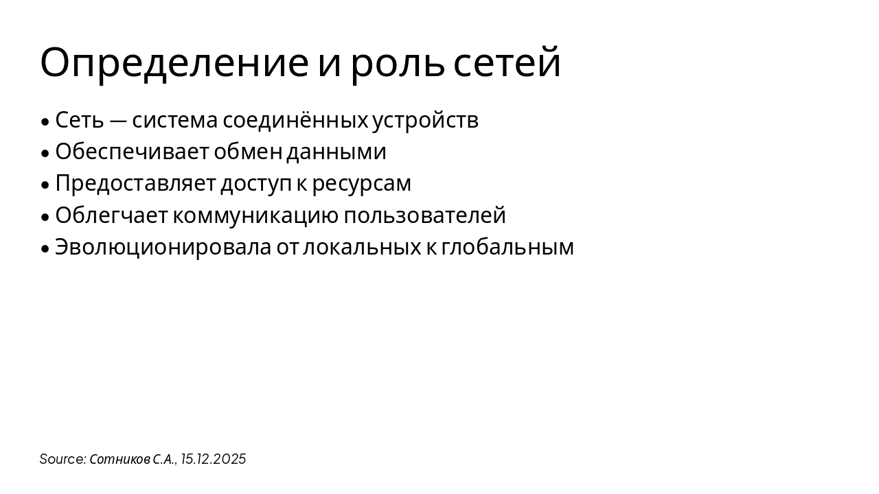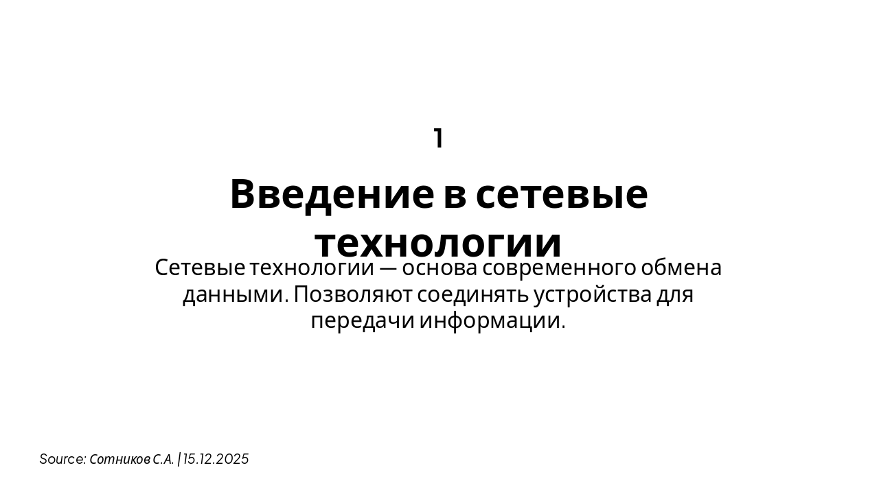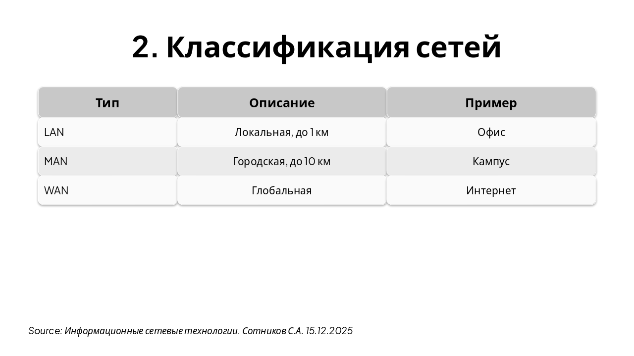 { "headers": [ "Этап", "Описание", "Ответственный" ], "rows": [ [ "Шаг 1: Выбор топологии", "Определение подходящей топологии сети (звезда, шина, кольцо и т.д.) в зависимости от требований", "Сетевой архитектор" ], [ "Шаг 2: Подключение устройств", "Физическое соединение устройств: компьютеры, коммутаторы, роутеры кабелями или беспроводно", "Сетевой администратор" ], [ "Шаг 3: Настройка протоколов", "Конфигурация сетевых протоколов: IP-адресация, маршрутизация, TCP/IP стек", "Сетевой инженер" ], [ "Шаг 4: Тестирование связи", "Проверка connectivity: ping, traceroute, тестирование производительности и устранение неисправностей", "Тестировщик" ] ] }