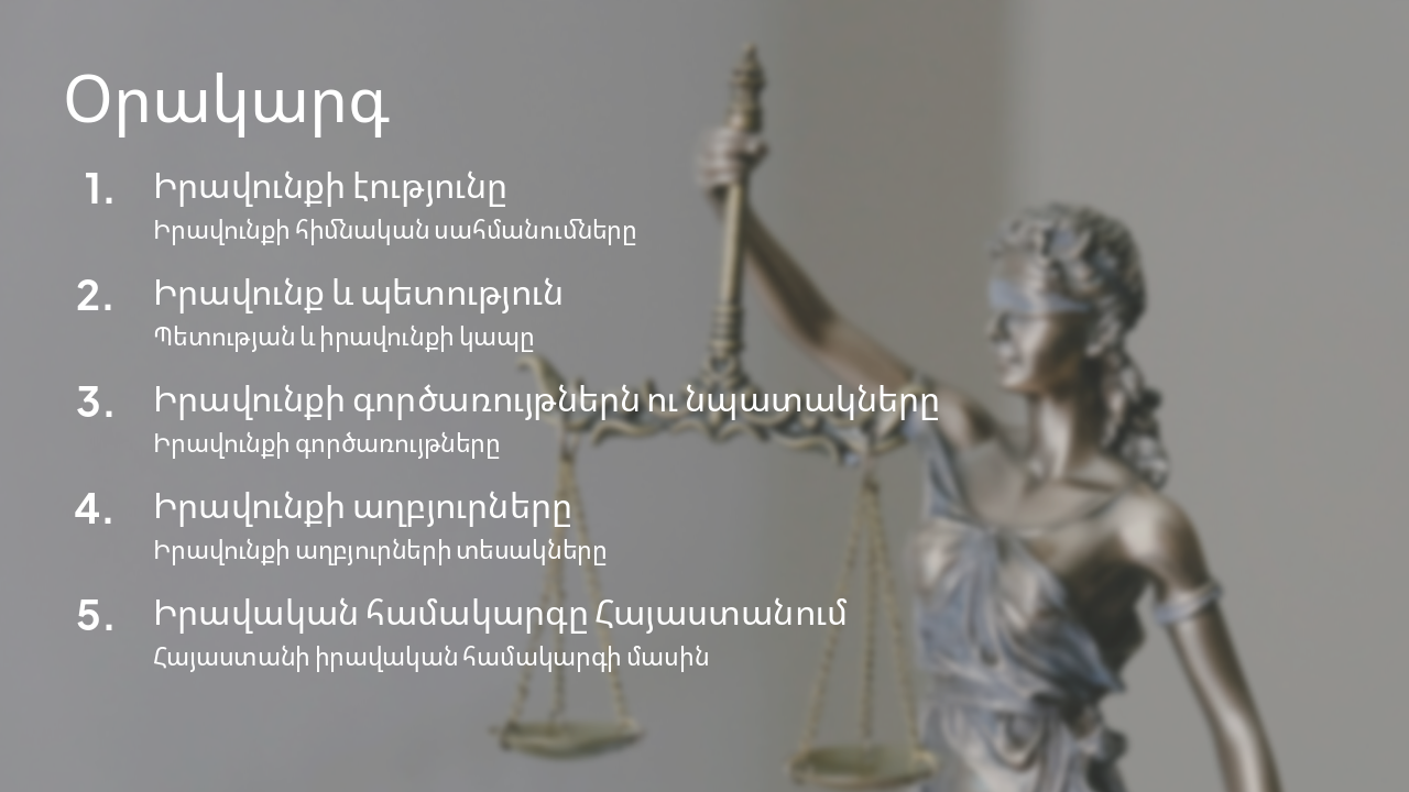 Ներկայացումը բացահայտում է իրավունքի էությունը, նրա սահմանումը, պետության հետ կապը, գործառույթներն ու նպատակները, աղբյուրները, ինչպես նաև Հայաստանի իրավական համակարգի առանձնահատկությունները: