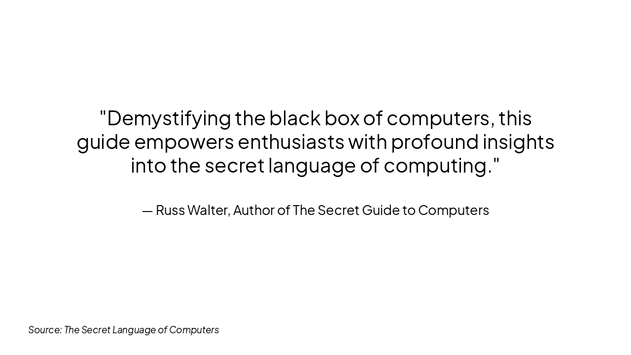 This is a title slide titled "The Secret Language of Computers." Its subtitle reads: "Unlocking secrets via hardware & software techniques š»."