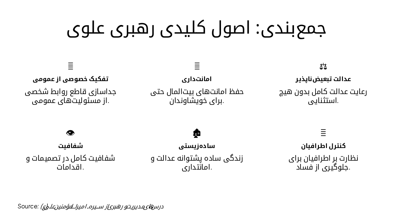 خلاصه اصول کلیدی رهبری برگرفته از سیره عملی امام علی(ع) در عدالت و امانتداری.