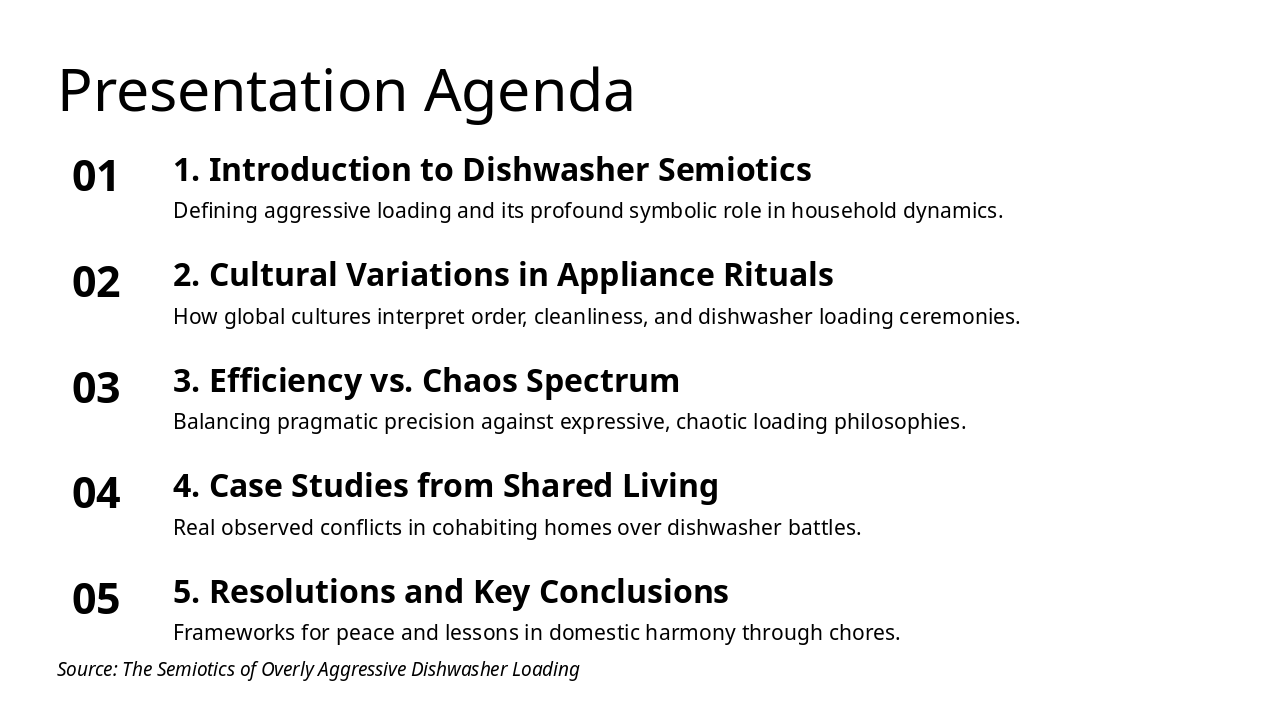 This agenda slide outlines a presentation on dishwasher loading semiotics, covering an introduction to aggressive loading's symbolic role in household dynamics, cultural variations in appliance rituals, and the efficiency vs. chaos spectrum. It concludes with case studies of shared living conflicts and resolutions for domestic harmony through chores.