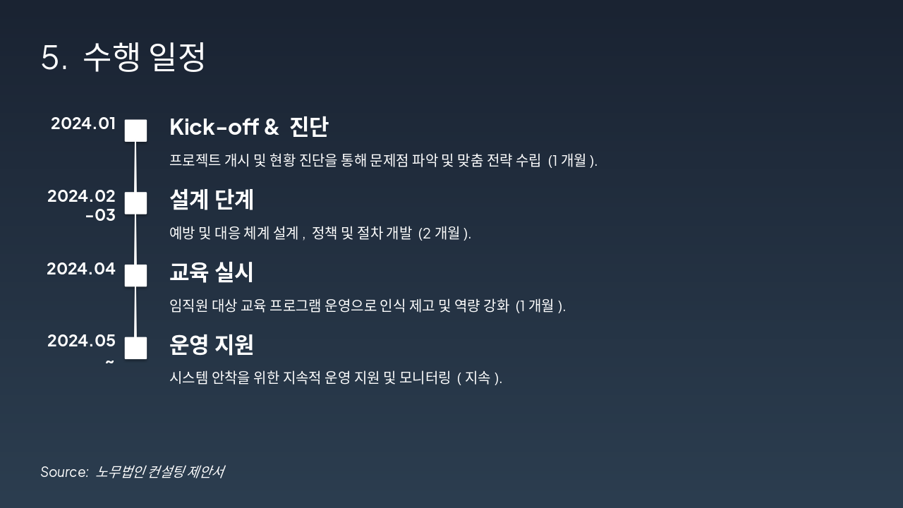2024.01: Kick-off & 진단 프로젝트 개시 및 현황 진단을 통해 문제점 파악 및 맞춤 전략 수립 (1개월). 2024.02-03: 설계 단계 예방 및 대응 체계 설계, 정책 및 절차 개발 (2개월). 2024.04: 교육 실시 임직원 대상 교육 프로그램 운영으로 인식 제고 및 역량 강화 (1개월). 2024.05~: 운영 지원 시스템 안착을 위한 지속적 운영 지원 및 모니터링 (지속).