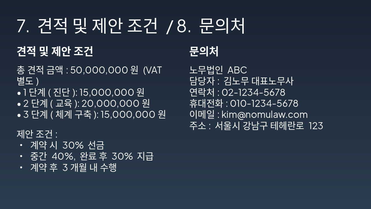 총 견적 금액은 VAT 별도 50,000,000원으로, 1단계(진단) 15백만원, 2단계(교육) 20백만원, 3단계(체계 구축) 15백만원이며, 제안 조건은 계약 시 30% 선금, 중간 40%, 완료 후 30% 지급과 계약 후 3개월 내 수행이다. 문의처는 노무법인 ABC의 김노무 대표노무사(연락처: 02-1234-5678, 010-1234-5678, 이메일: kim@nomulaw.com, 주소: 서울시 강남구 테헤란로 123)이다.