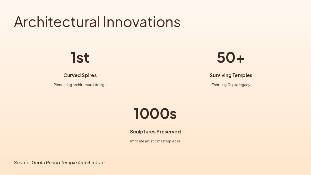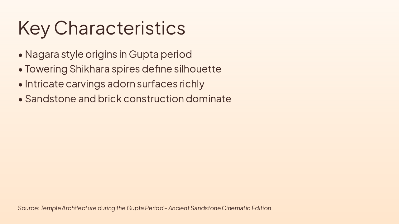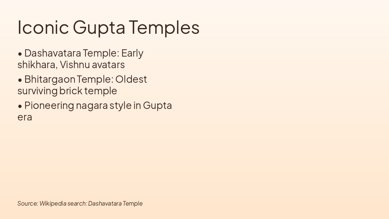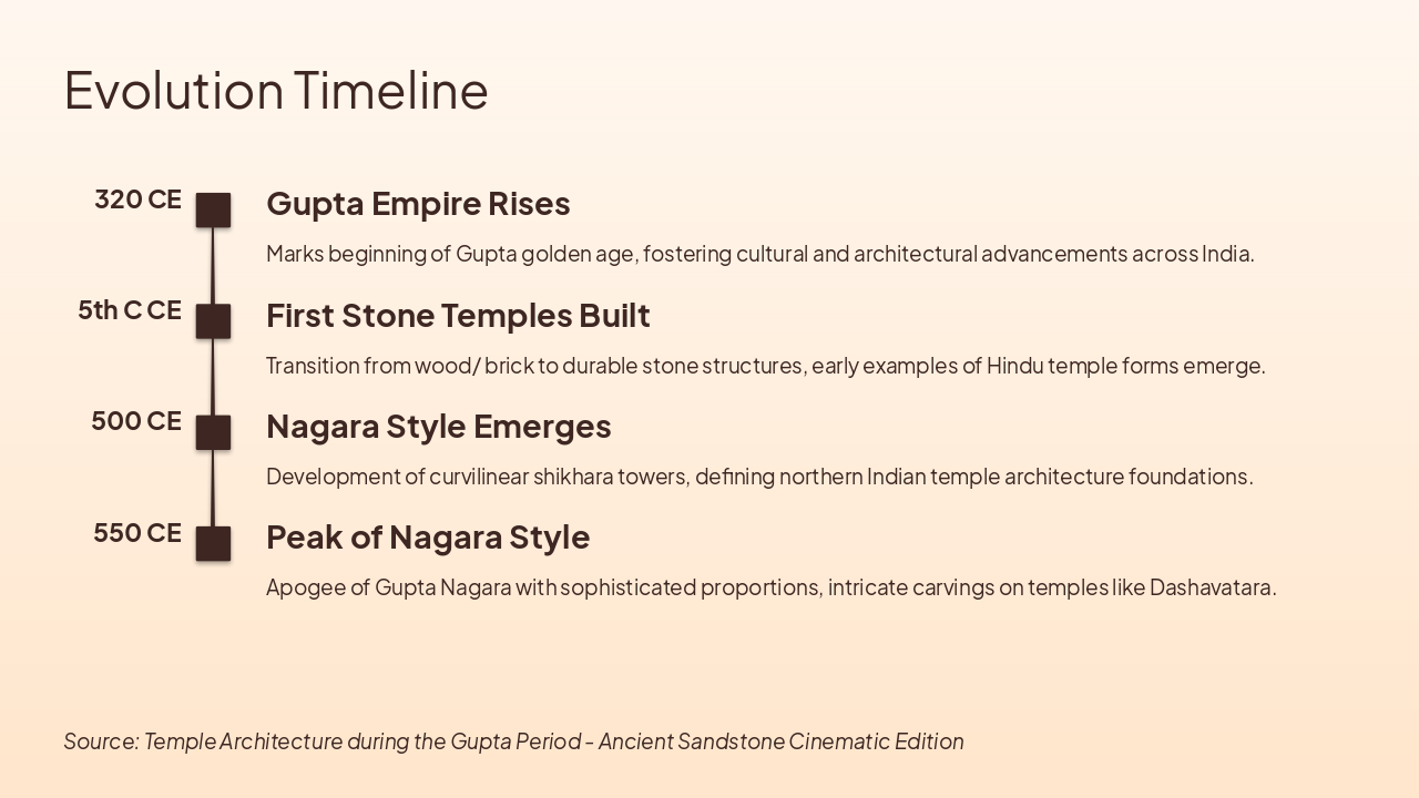 320 CE: Gupta Empire Rises Marks beginning of Gupta golden age, fostering cultural and architectural advancements across India. 5th C CE: First Stone Temples Built Transition from wood/ brick to durable stone structures, early examples of Hindu temple forms emerge. 500 CE: Nagara Style Emerges Development of curvilinear shikhara towers, defining northern Indian temple architecture foundations. 550 CE: Peak of Nagara Style Apogee of Gupta Nagara with sophisticated proportions, intricate carvings on temples like Dashavatara.