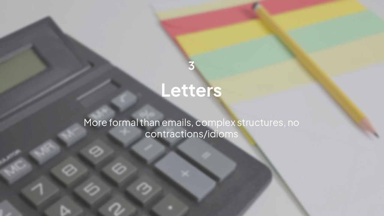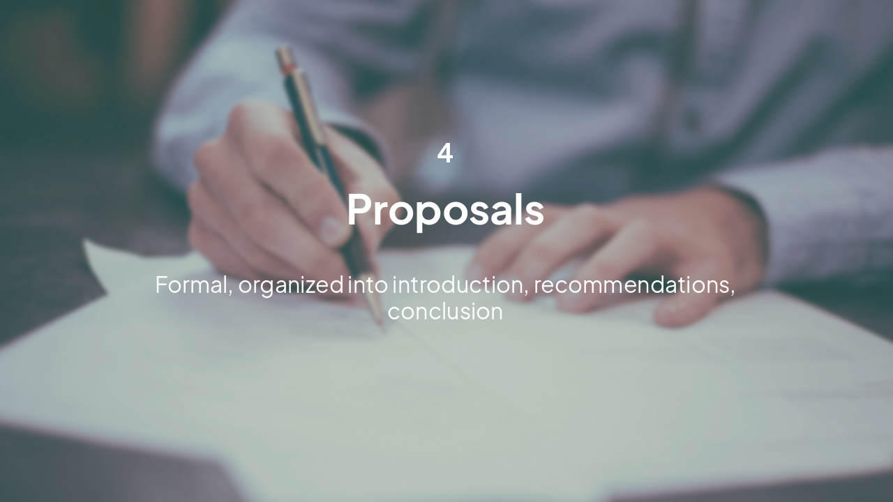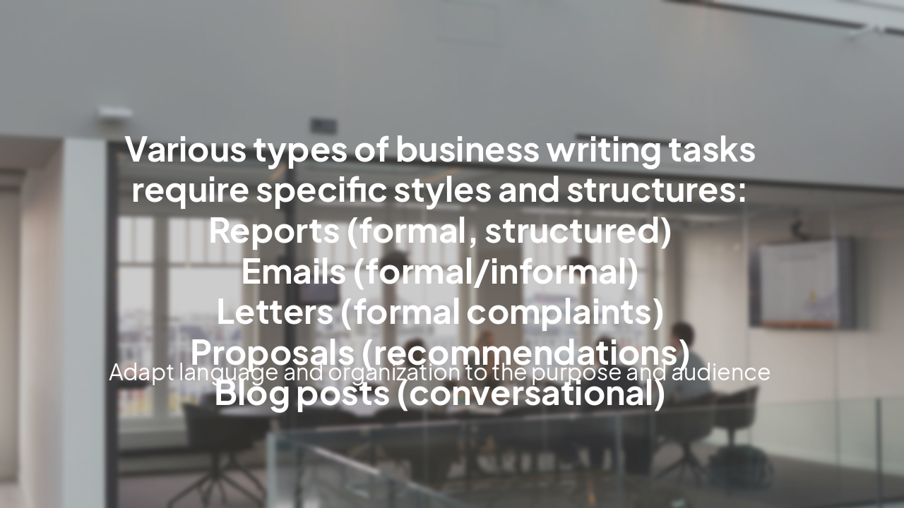 Various types of business writing tasks require specific styles and structures: Reports (formal, structured) Emails (formal/informal) Letters (formal complaints) Proposals (recommendations) Blog posts (conversational)