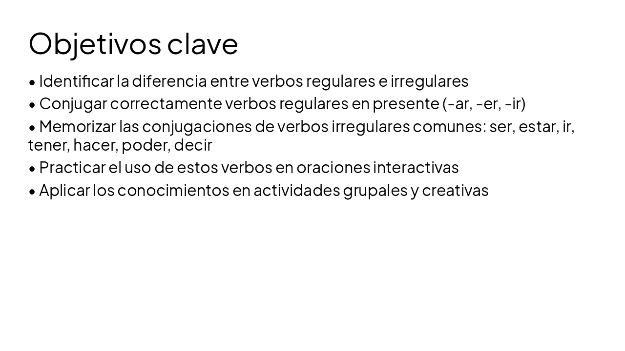 Presentación interactiva de 2 horas para estudiantes de secundaria. Explora conjugaciones de verbos regulares (-AR, -ER, -IR) e irregulares comunes (ser, estar, ir, tener, hacer, poder, decir) en presente, con objetivos claros, rompehielos, prácticas