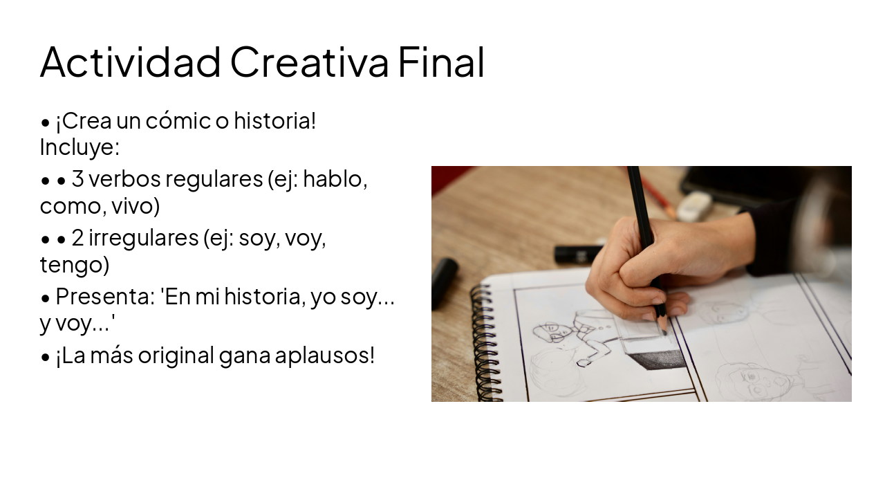 Crear una presentación de 2 horas (aprox. 25-30 diapositivas) titulada "Verbos regulares e irregulares del español" dirigida a estudiantes de nivel secundario. Debe incluir: 1) Portada atractiva 2) Objetivos de aprendizaje claros 3) Actividad rompehielo interactiva 4) Explicación de verbos regulares (-ar, -er, -ir) en presente 5) Tablas visuales de conjugación 6) Prácticas guiadas con preguntas para interacción tutor/estudiante 7) Sección de verbos irregulares más comunes (ser, estar, ir, tener, hacer, poder, decir) 8) Comparación visual entre regularidad e irregularidad 9) Actividades en parejas 10) Mini quiz formativo 11) Actividad creativa final 12) Resumen y cierre Cada diapositiva debe incluir: - Título claro - Contenido organizado con viñetas - Elementos visuales sugeridos (iconos, tablas, colores) - Indicaciones para interacción continua (preguntas directas al estudiante) - Notas del presentador con guía pedagógica Diseño moderno, visualmente organizado, colores educativos (azul, verde, naranja), uso de tablas y esquemas claros. Lenguaje claro y dinámico.