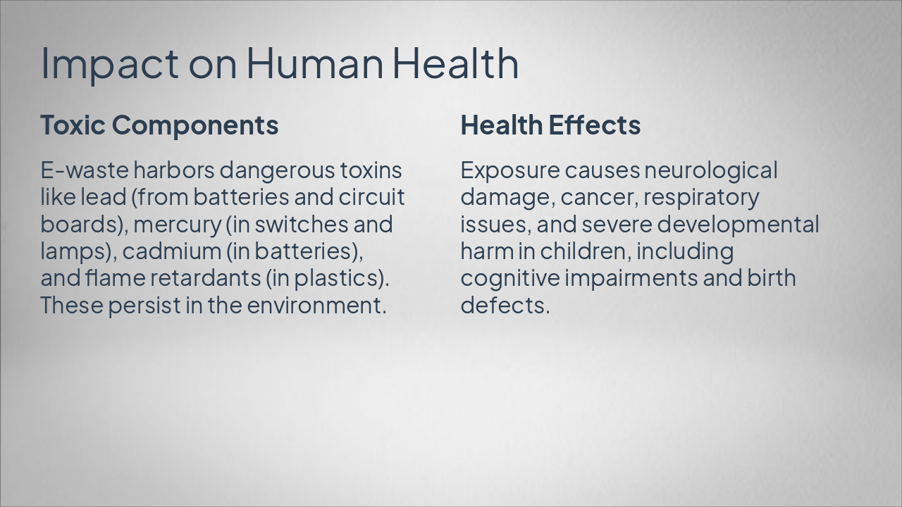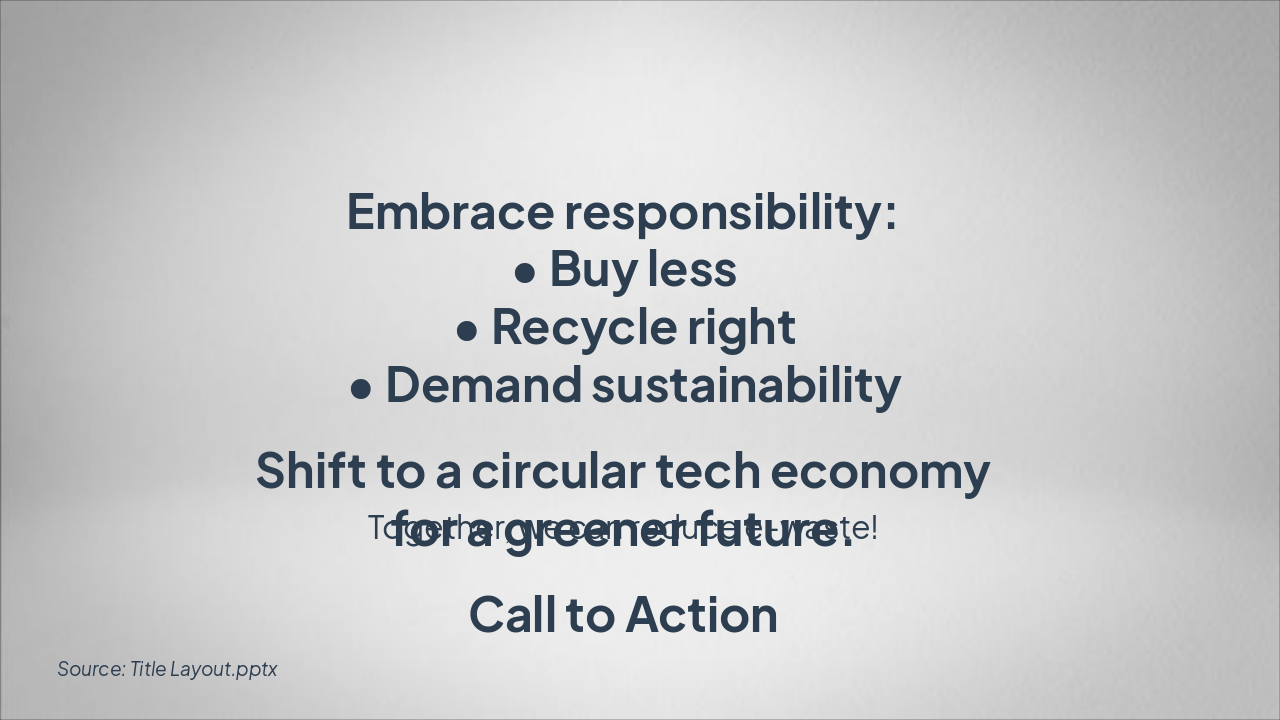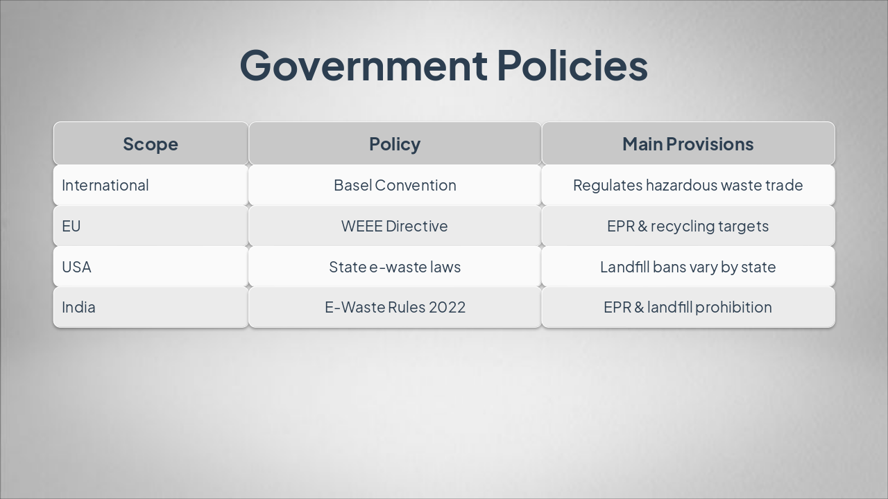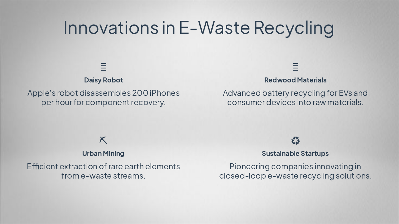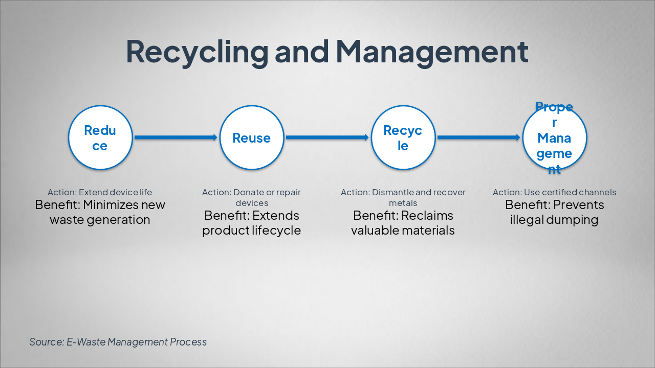 { "headers": [ "Phase", "Action", "Benefit" ], "rows": [ [ "Reduce", "Extend device life", "Minimizes new waste generation" ], [ "Reuse", "Donate or repair devices", "Extends product lifecycle" ], [ "Recycle", "Dismantle and recover metals", "Reclaims valuable materials" ], [ "Proper Management", "Use certified channels", "Prevents illegal dumping" ] ] }