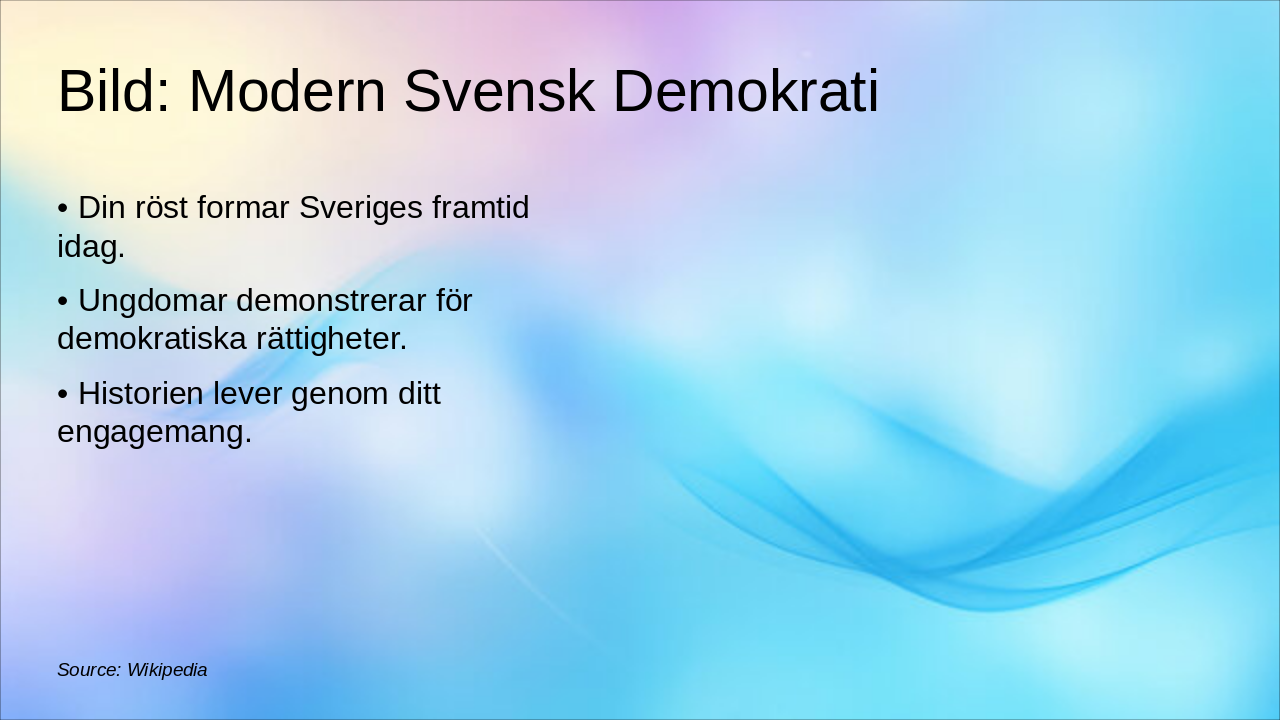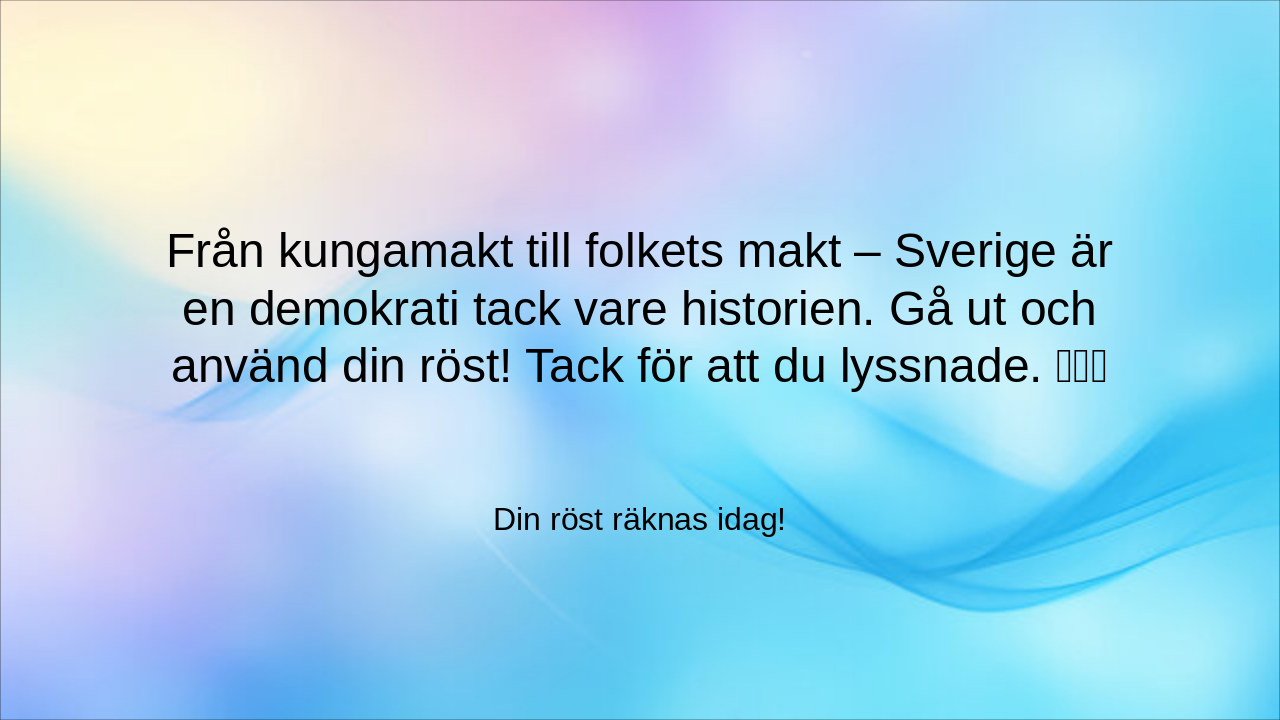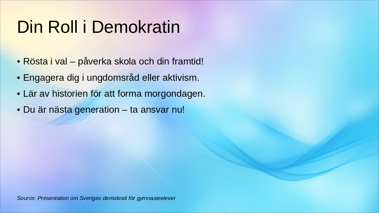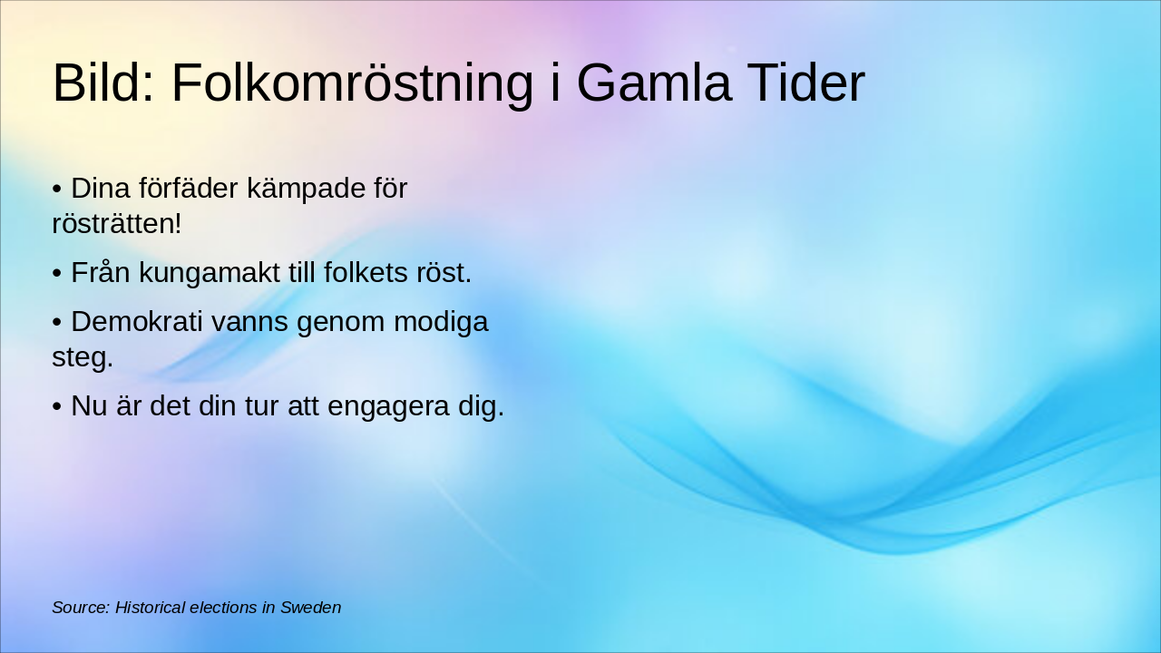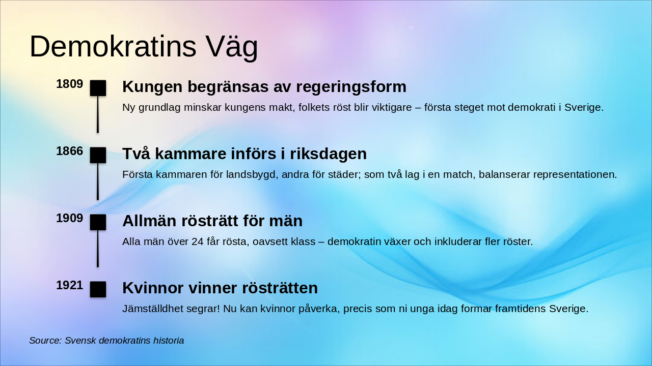 1809: Kungen begränsas av regeringsform Ny grundlag minskar kungens makt, folkets röst blir viktigare – första steget mot demokrati i Sverige. 1866: Två kammare införs i riksdagen Första kammaren för landsbygd, andra för städer; som två lag i en match, balanserar representationen. 1909: Allmän rösträtt för män Alla män över 24 får rösta, oavsett klass – demokratin växer och inkluderar fler röster. 1921: Kvinnor vinner rösträtten Jämställdhet segrar! Nu kan kvinnor påverka, precis som ni unga idag formar framtidens Sverige.