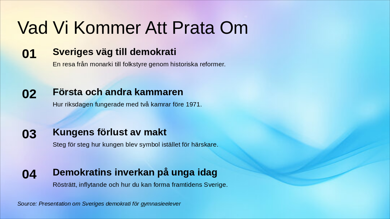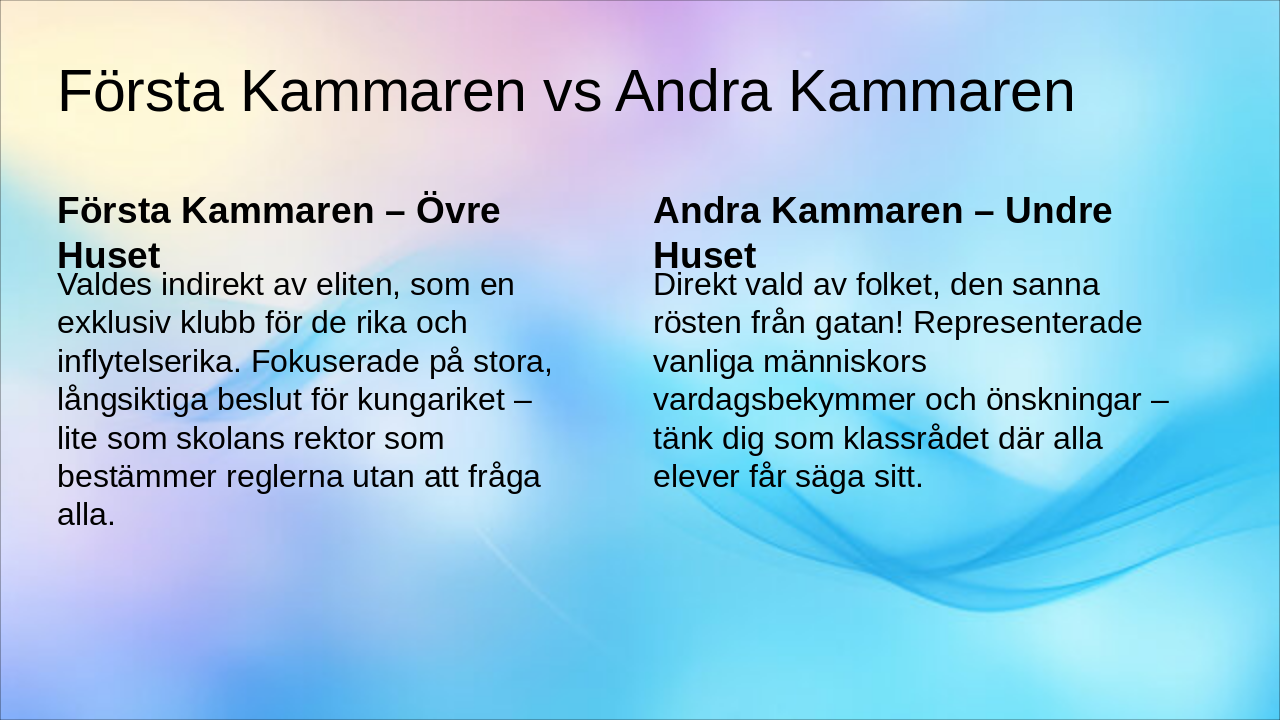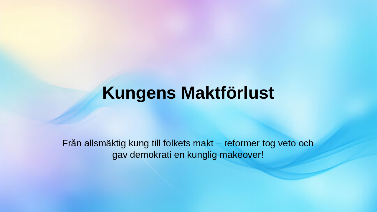 Engagerande presentation för gymnasieelever: Förklara hur kungen förlorade makt stegvis, vad första kammaren (lantmanna) och andra (borgar) var – som olika lagrum i skolan. Relatera till idag: Ni unga kan rösta och påverka klimat och skola! Använd bilder: Historiska kungar, röstande kvinnor, moderna ungdomsprotester. Ton: Lättsam, 'Frihet steg för steg, precis som att level up i ett spel!'