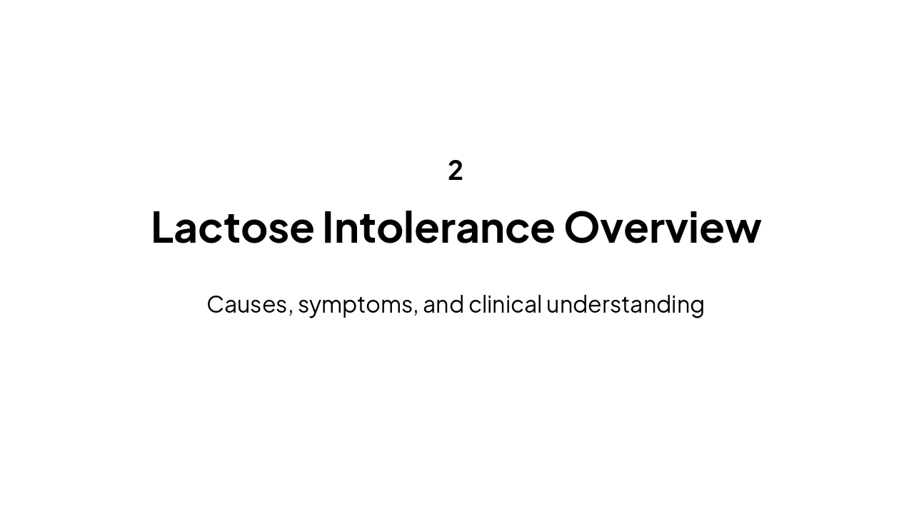This presentation covers the fundamentals of lactose metabolism, defines lactose intolerance including symptoms and types, explores diagnosis and management strategies, and examines global prevalence alongside the evolutionary history of lactase pers