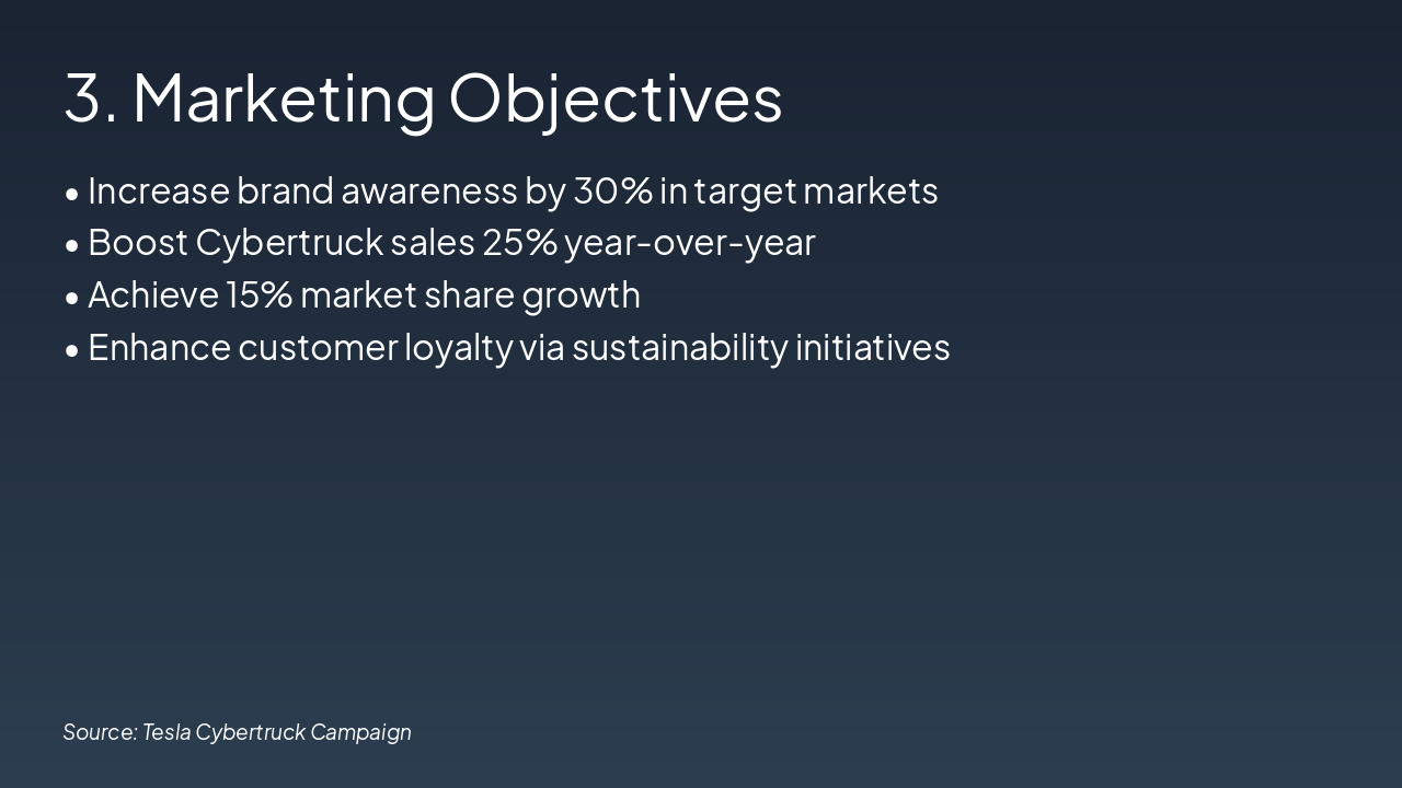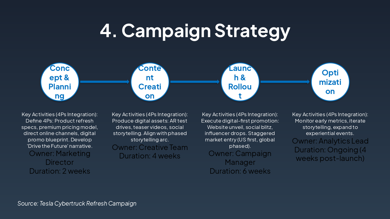 This slide outlines the phased rollout of our 'Drive the Future' campaign strategy, built on the 4Ps: Product (Cybertruck refresh with enhanced autonomy and design), Price (premium positioning at $99,990+), Place (online/direct via Tesla.com and showrooms), Promotion (digital-first with AR/VR experiences and influencer partnerships). The integrated storytelling unifies all elements around innovation and futurism, ensuring a cohesive launch.