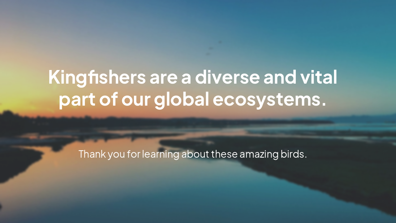 Presentation about the Kingfisher bird. Include slides: title, overview of kingfishers, physical characteristics, habitat and distribution, diet and hunting behavior, different species of kingfishers, role in ecosystems, interesting facts, conservation status, and conclusion.