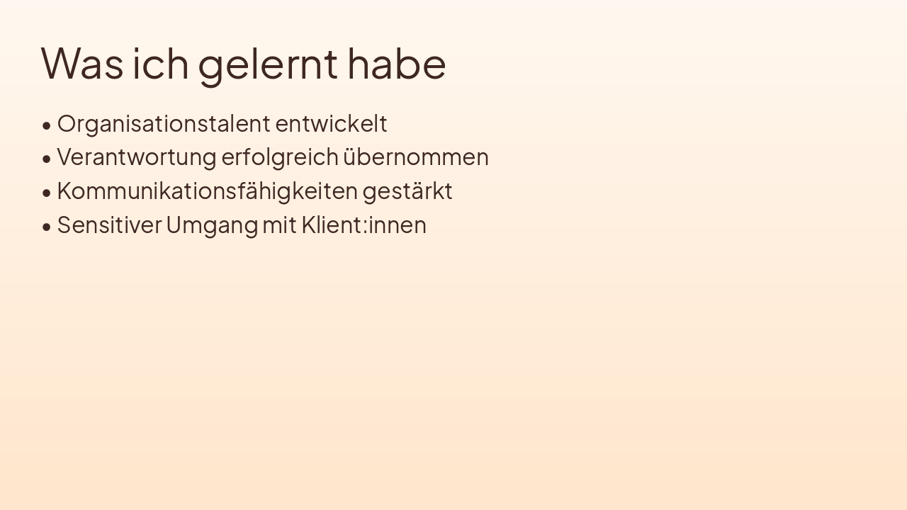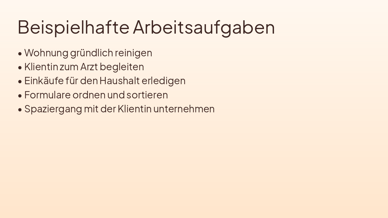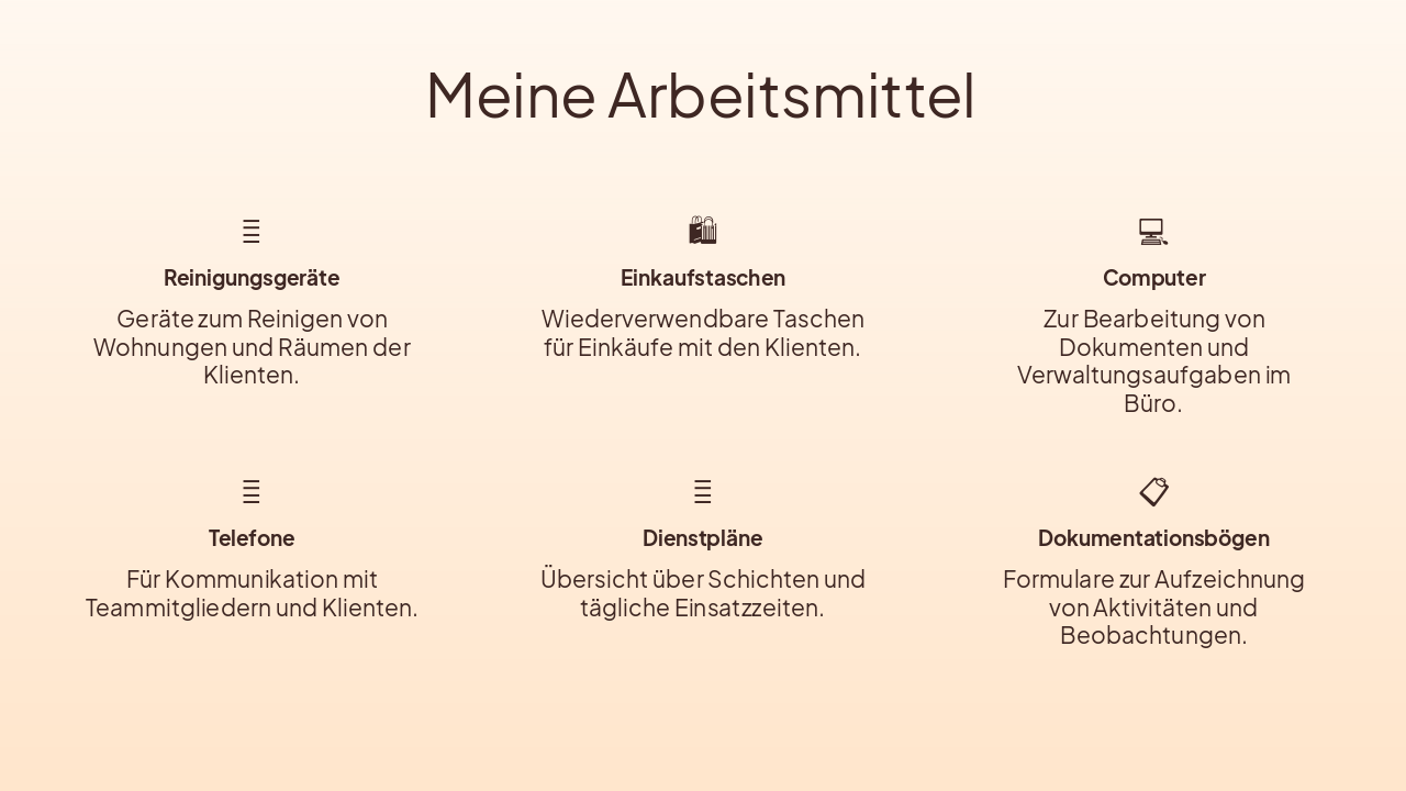 { "features": [ { "icon": "🧹", "heading": "Reinigungsgeräte", "description": "Geräte zum Reinigen von Wohnungen und Räumen der Klienten." }, { "icon": "🛍️", "heading": "Einkaufstaschen", "description": "Wiederverwendbare Taschen für Einkäufe mit den Klienten." }, { "icon": "💻", "heading": "Computer", "description": "Zur Bearbeitung von Dokumenten und Verwaltungsaufgaben im Büro." }, { "icon": "📞", "heading": "Telefone", "description": "Für Kommunikation mit Teammitgliedern und Klienten." }, { "icon": "📅", "heading": "Dienstpläne", "description": "Übersicht über Schichten und tägliche Einsatzzeiten." }, { "icon": "📋", "heading": "Dokumentationsbögen", "description": "Formulare zur Aufzeichnung von Aktivitäten und Beobachtungen." } ] }
