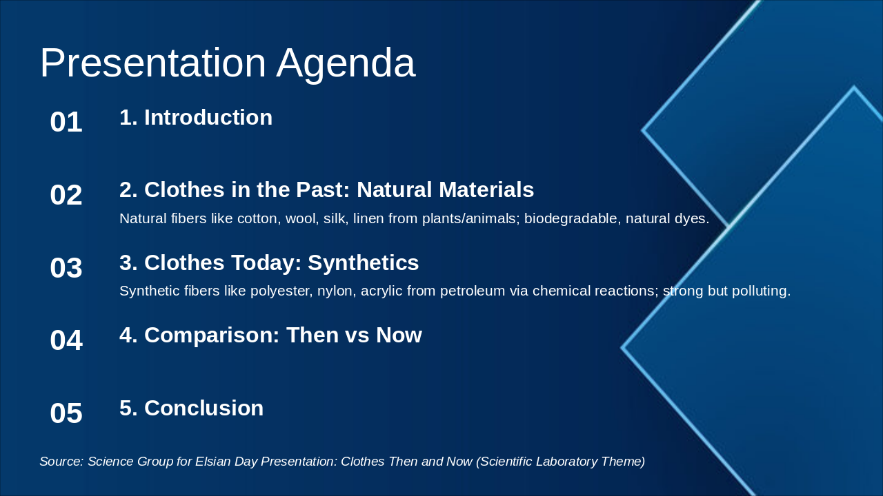 This agenda slide outlines a presentation on clothing materials, starting with an introduction. It covers natural fibers from the past (cotton, wool, etc., biodegradable with natural dyes), modern synthetics (polyester, nylon from petroleum, strong but polluting), a then-vs-now comparison, and a conclusion.
