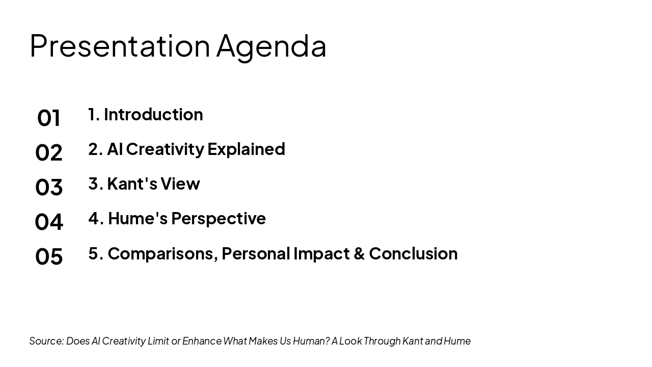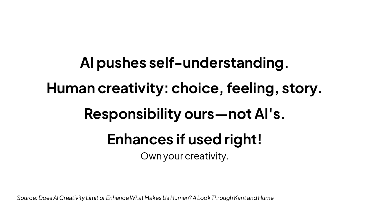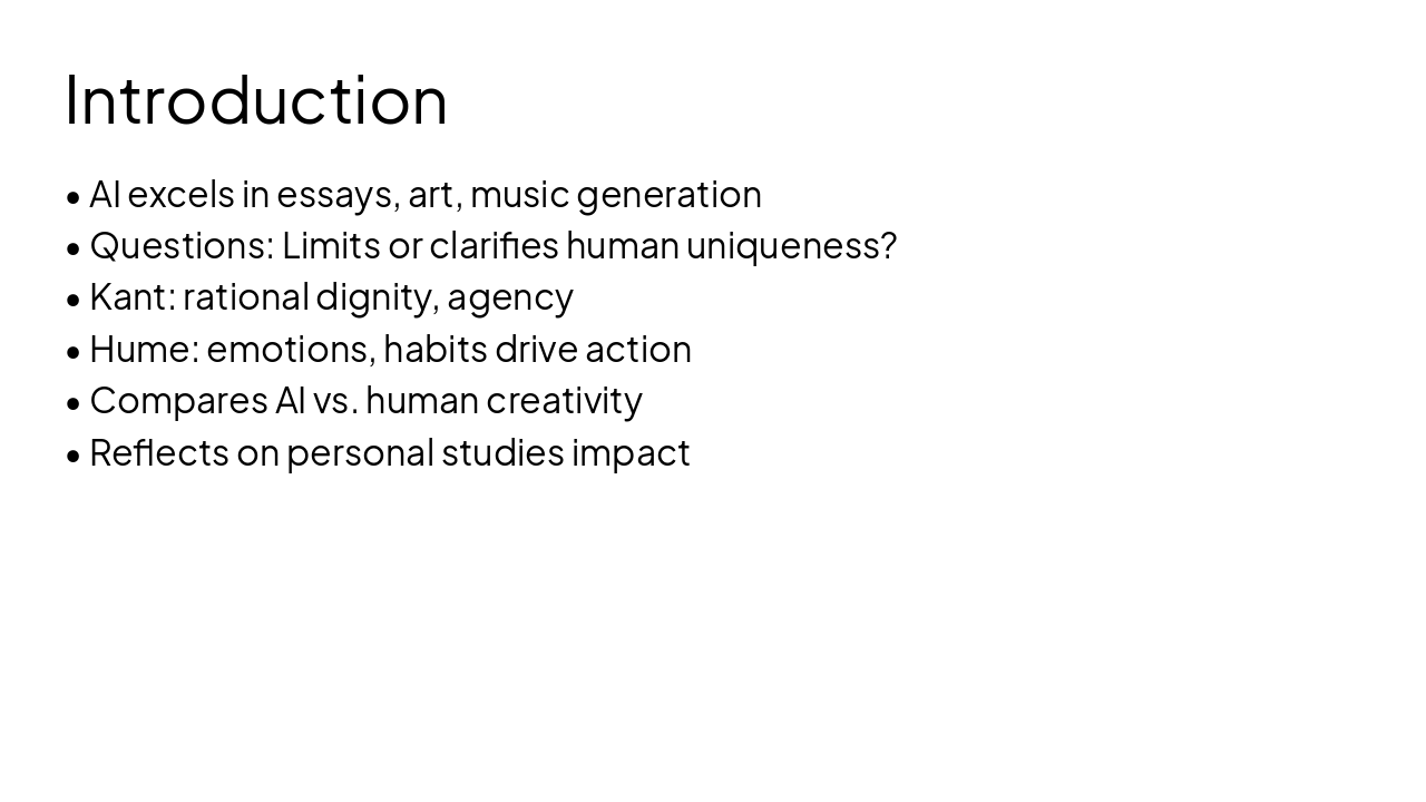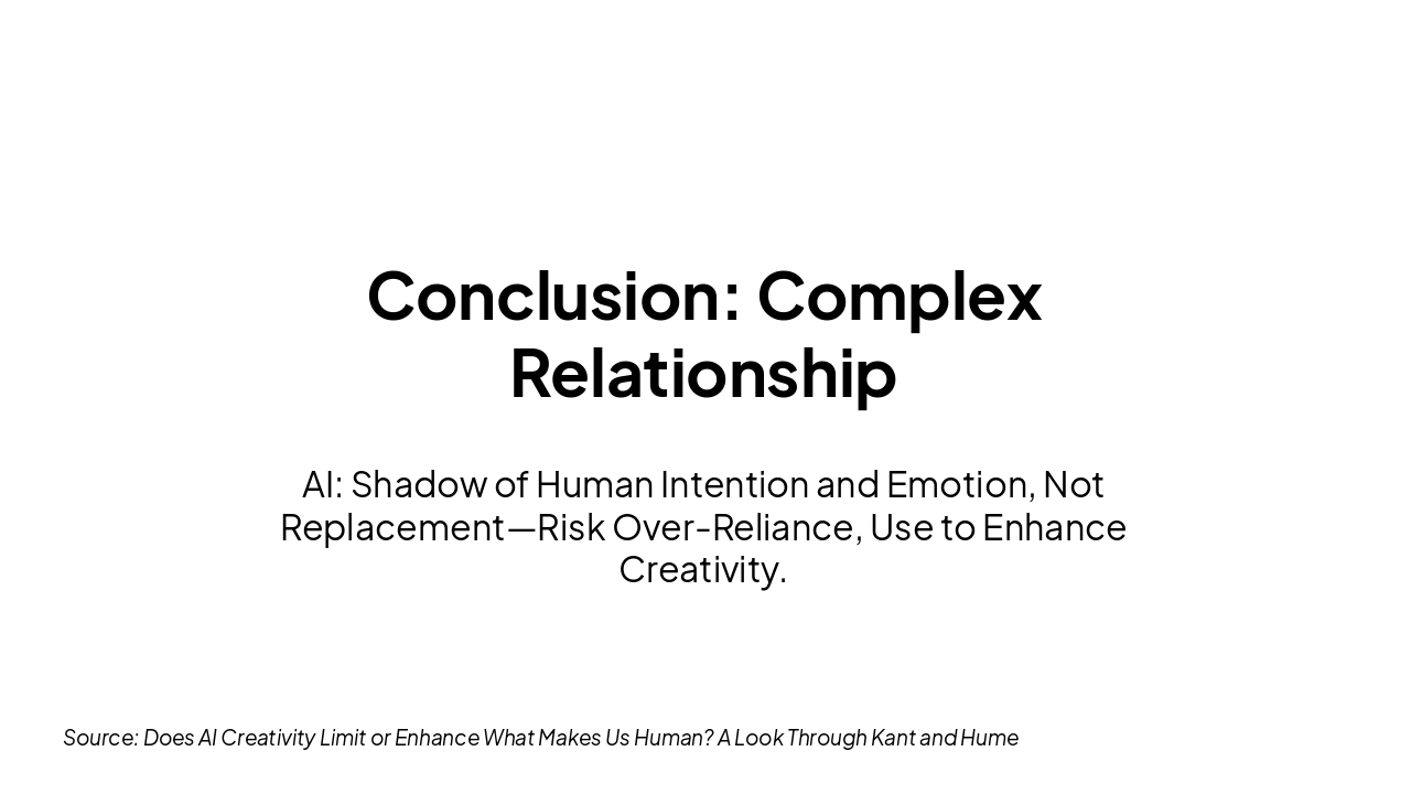 After examining AI through Kant and Hume, I believe that AI neither destroys nor replaces human creativity. Instead, it pushes us to understand ourselves more deeply. Human creativity is meaningful because it comes from a mind that can choose, from a heart that can feel, and from a life that has a story. AI has none of these. So the question is not whether AI limits what makes us human, but whether we allow ourselves to forget the inner sources of our creativity. If we use AI wisely, it can enhance our ability to create. But if we allow AI to think for us, we lose something essential. The responsibility lies with us, not with the technology.