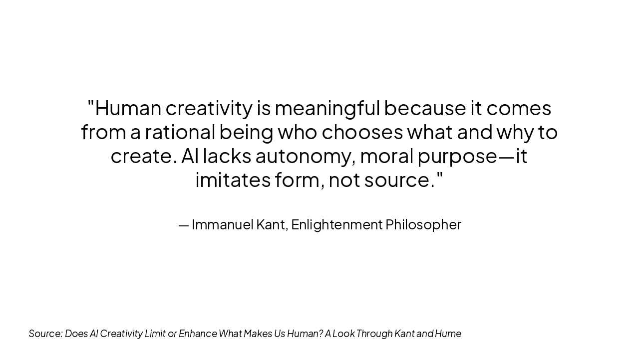 Kant helps us understand why human creativity cannot be replaced by AI. According to Kant, human beings have a unique dignity because we can think rationally, act intentionally, and make moral decisions. A human creative act is not only about producing content; it is an expression of a person’s inner principles, worldview, and autonomy. When a human writes a story, paints a picture, or composes music, there is a purpose behind the work—sometimes a moral purpose, sometimes a personal struggle, and sometimes a search for meaning.