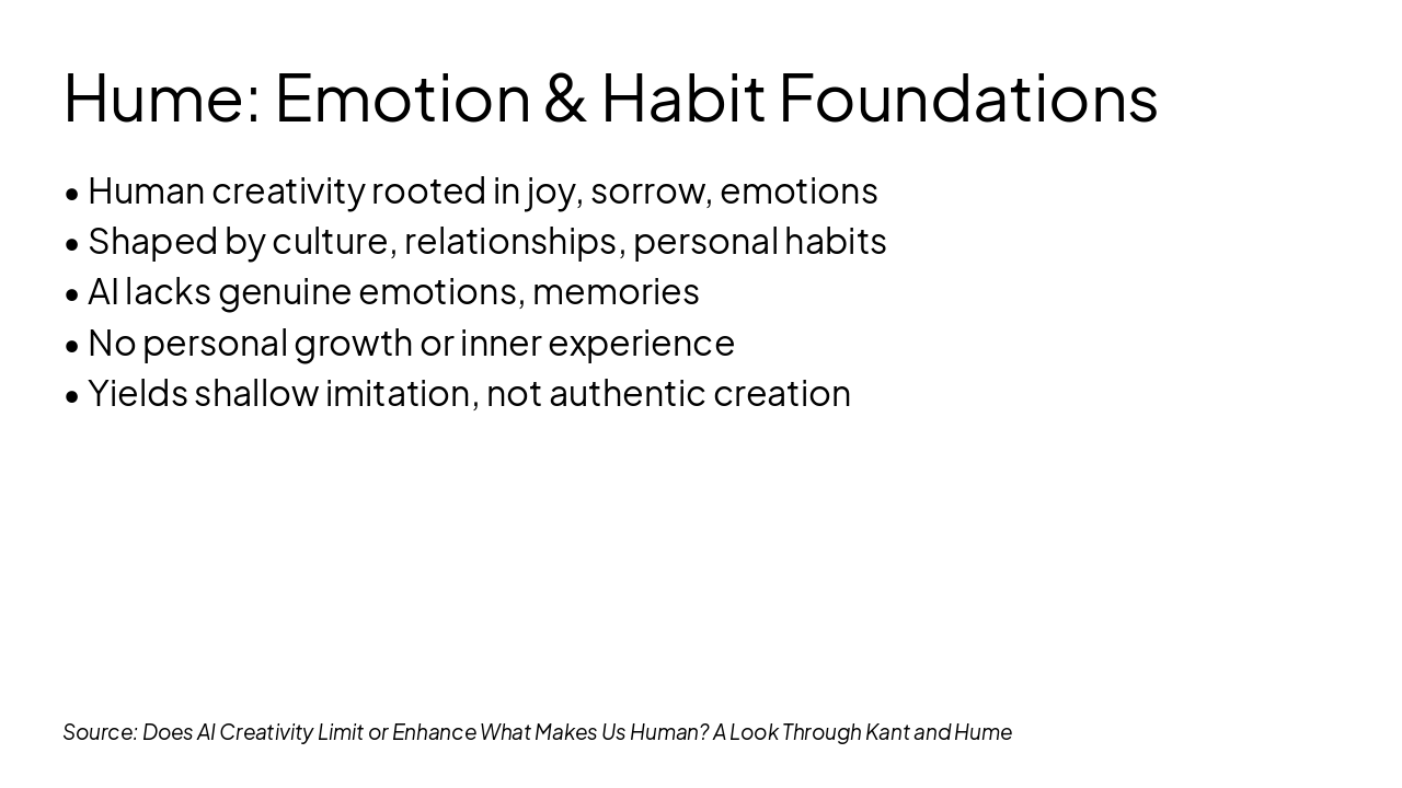 AI does not have emotions, memories, or personal habits. It does not long for anything or fear anything. It does not grow or mature. This means AI cannot participate in the emotional and experiential foundation of human creativity that Hume describes. It can produce text that looks emotional, but it cannot actually feel what it is expressing. So from Hume’s point of view, AI creativity is shallow compared to human creativity because it lacks the inner experience that gives human work its authenticity.