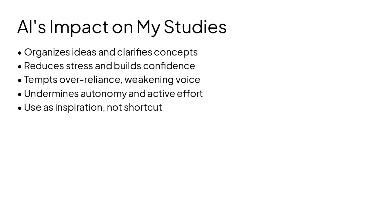 However, AI has also created challenges. When I am tired, I sometimes feel tempted to let AI do too much of the thinking for me. If I rely too heavily on AI-generated phrasing, my own creative voice becomes weaker. It can make me passive rather than active, which goes against both Kant’s emphasis on rational autonomy and Hume’s idea that creativity emerges from my own emotional experiences and habits. I have to consciously decide when AI is helping me grow and when it is replacing effort that I need to make myself.