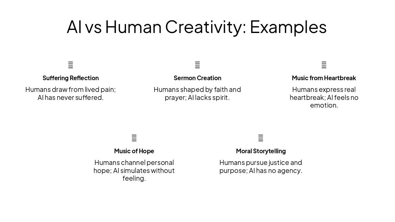 These examples show that AI can imitate the appearance of creativity, but human creativity carries intention, emotion, memory, and responsibility—qualities that AI does not have.