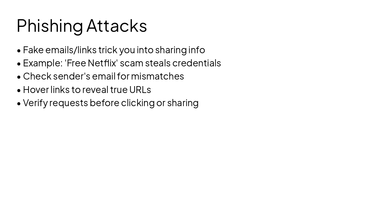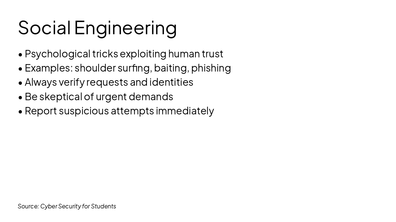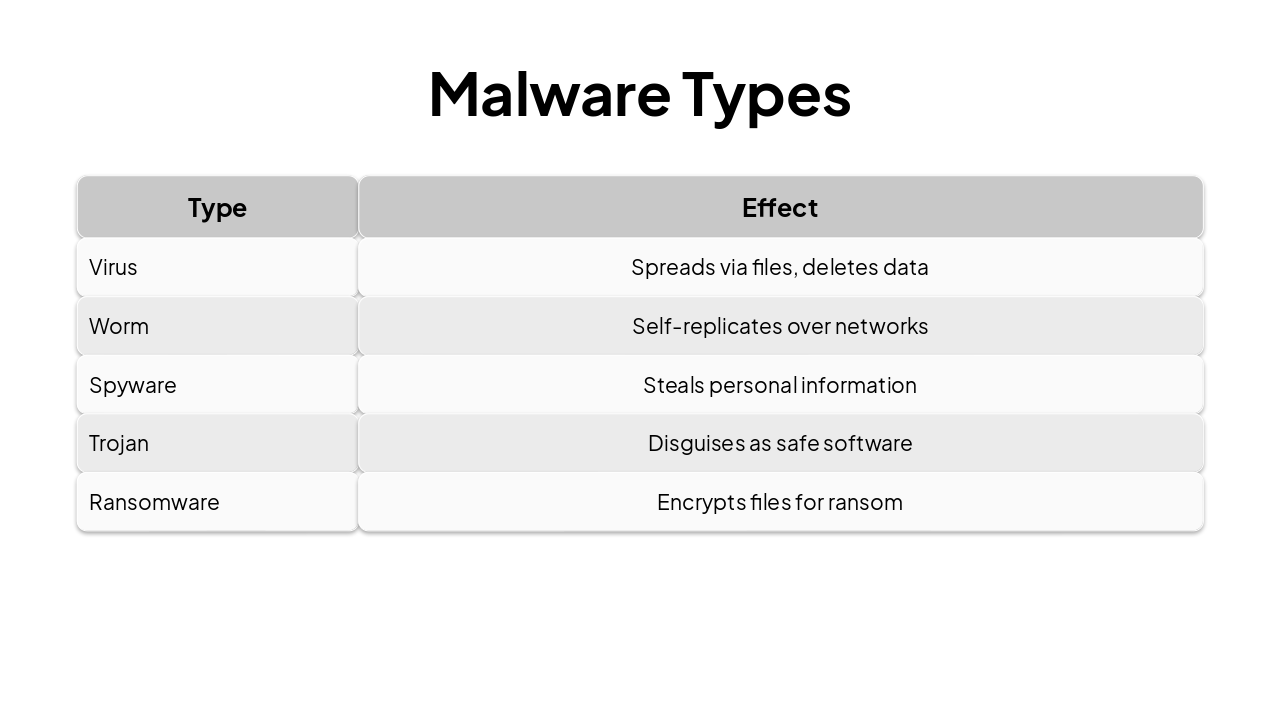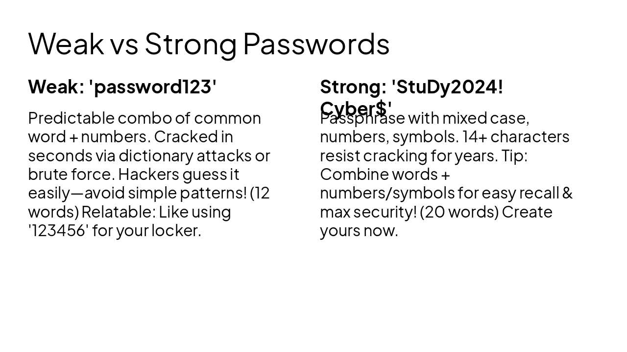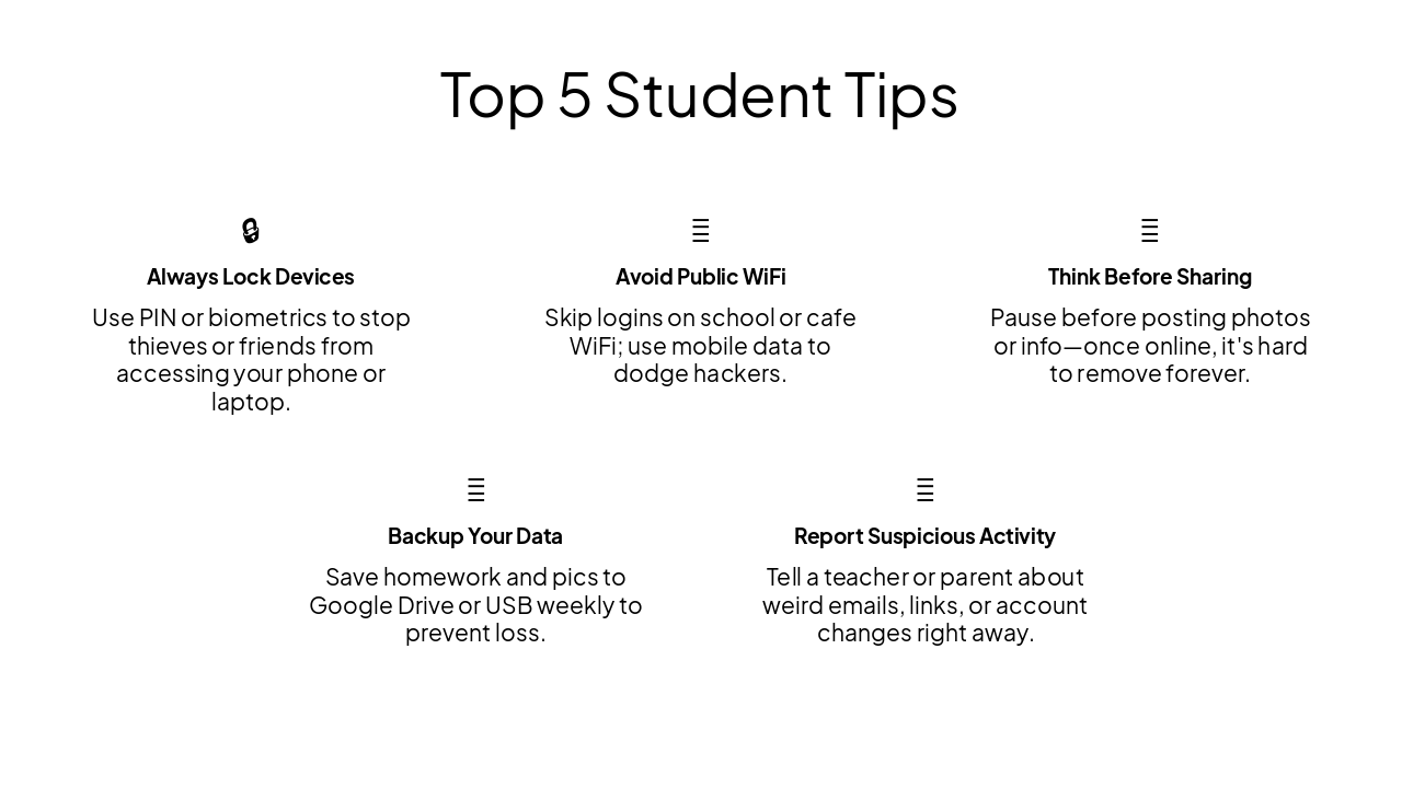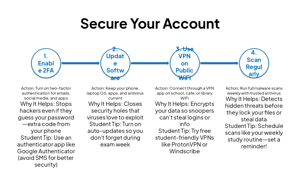 { "headers": [ "Step", "Action", "Why It Helps", "Student Tip" ], "rows": [ [ "1. Enable 2FA", "Turn on two-factor authentication for emails, social media, and apps", "Stops hackers even if they guess your password—extra code from your phone", "Use an authenticator app like Google Authenticator (avoid SMS for better security)" ], [ "2. Update Software", "Keep your phone, laptop OS, apps, and antivirus current", "Closes security holes that viruses love to exploit", "Turn on auto-updates so you don't forget during exam week" ], [ "3. Use VPN on Public WiFi", "Connect through a VPN app on school, cafe, or library WiFi", "Encrypts your data so snoopers can't steal logins or info", "Try free student-friendly VPNs like ProtonVPN or Windscribe" ], [ "4. Scan Regularly", "Run full malware scans weekly with trusted antivirus", "Detects hidden threats before they lock your files or steal data", "Schedule scans like your weekly study routine—set a reminder!" ] ] }