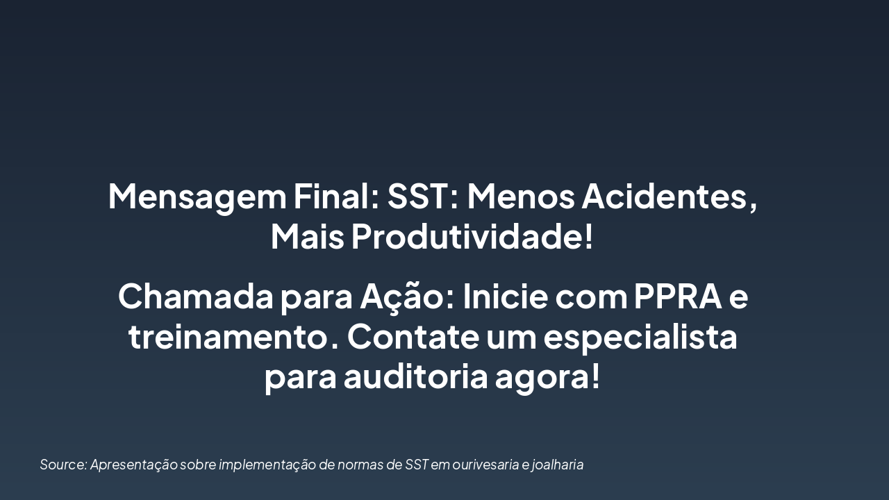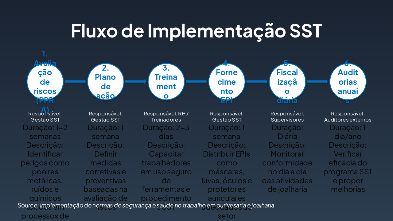 Este slide de título aborda a implementação de normas de SST em ourivesaria e joalharia. O subtítulo destaca a segurança e saúde no trabalho, focando em riscos e práticas essenciais.