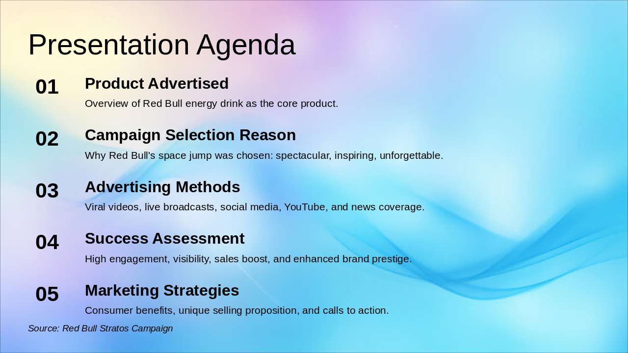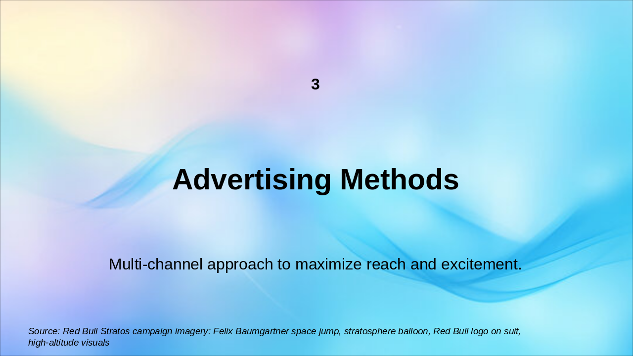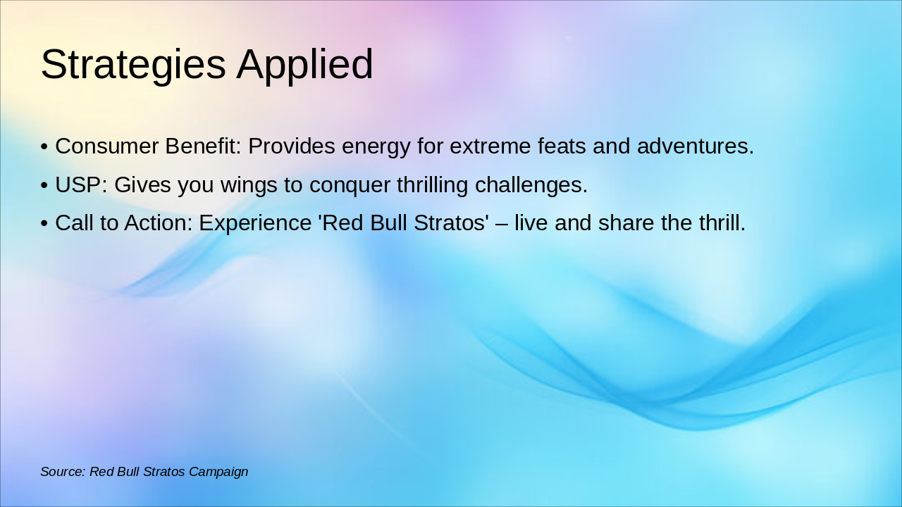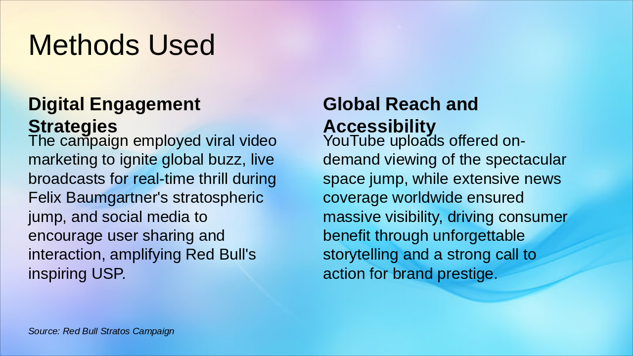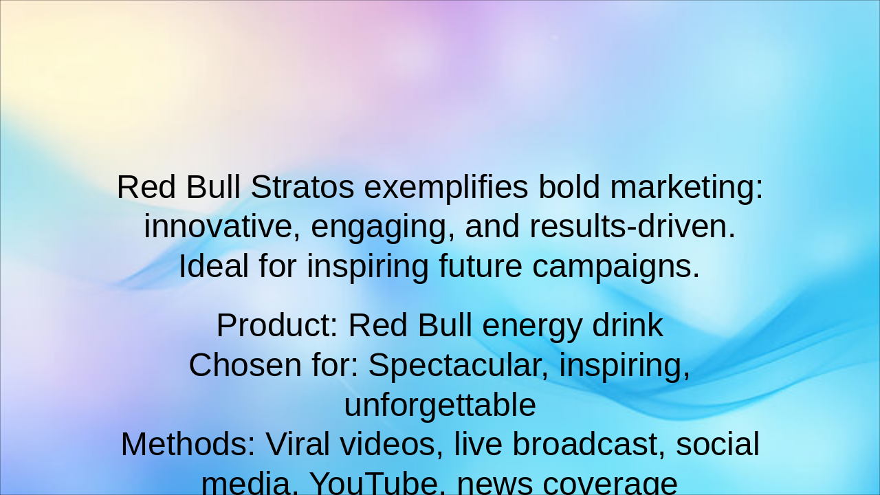 Product: Red Bull energy drink Chosen for: Spectacular, inspiring, unforgettable Methods: Viral videos, live broadcast, social media, YouTube, news coverage Success: High global engagement, massive visibility, increased sales, brand prestige Strategies: Consumer benefit (energy boost), USP (gives you wings), call to action (join the adventure)