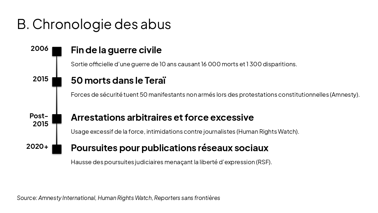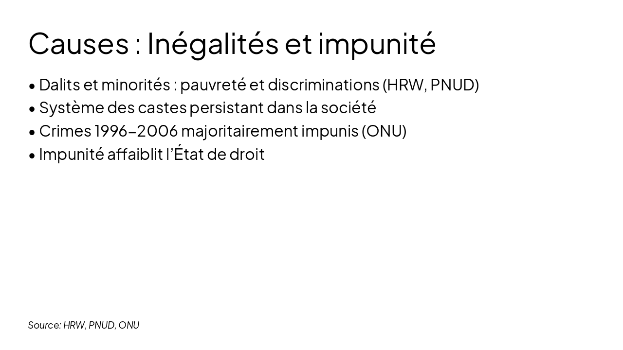 En résumé, les abus des droits humains au Népal sont liés à des inégalités sociales, à un passé non résolu et à des institutions encore fragiles. Les données fournies par l’ONU, Amnesty International et Human Rights Watch montrent que ces abus sont réels, documentés et persistants.