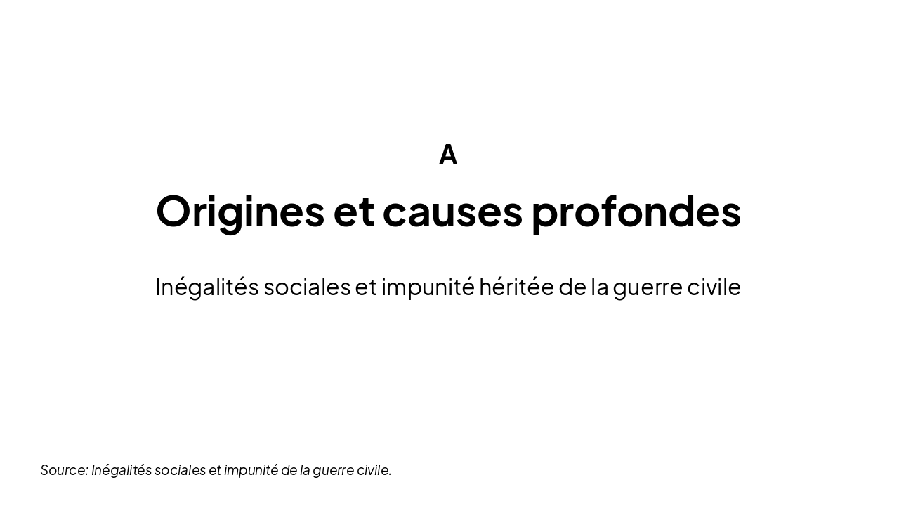 Un autre facteur essentiel est l’impunité liée à la guerre civile. D’après l’ONU, la grande majorité des crimes commis entre 1996 et 2006 n’ont jamais été jugés. Les commissions de vérité mises en place n’ont pas le pouvoir de condamner les responsables.