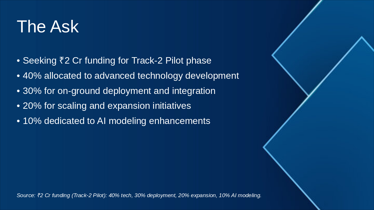 13. Ask: ₹2 Cr funding (Track-2 Pilot): 40% tech, 30% deployment, 20% expansion, 10% AI modeling.