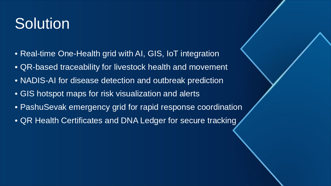 4. Solution: Real-time One-Health grid with AI, GIS, IoT, QR-based traceability. Key features: NADIS-AI, GIS hotspot maps, PashuSevak emergency grid, QR Health Certificates, DNA Ledger.