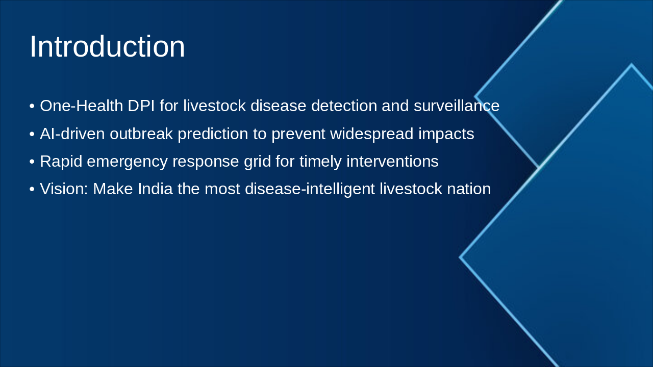 2. Introduction: One-Health DPI for livestock disease detection, outbreak prediction, emergency response. Vision: make India the most disease-intelligent livestock nation.