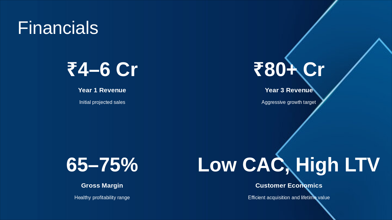 10. Financials: Year 1 ₹4–6Cr → Year 3 ₹80+Cr. Gross margin 65–75%, low CAC, high LTV.