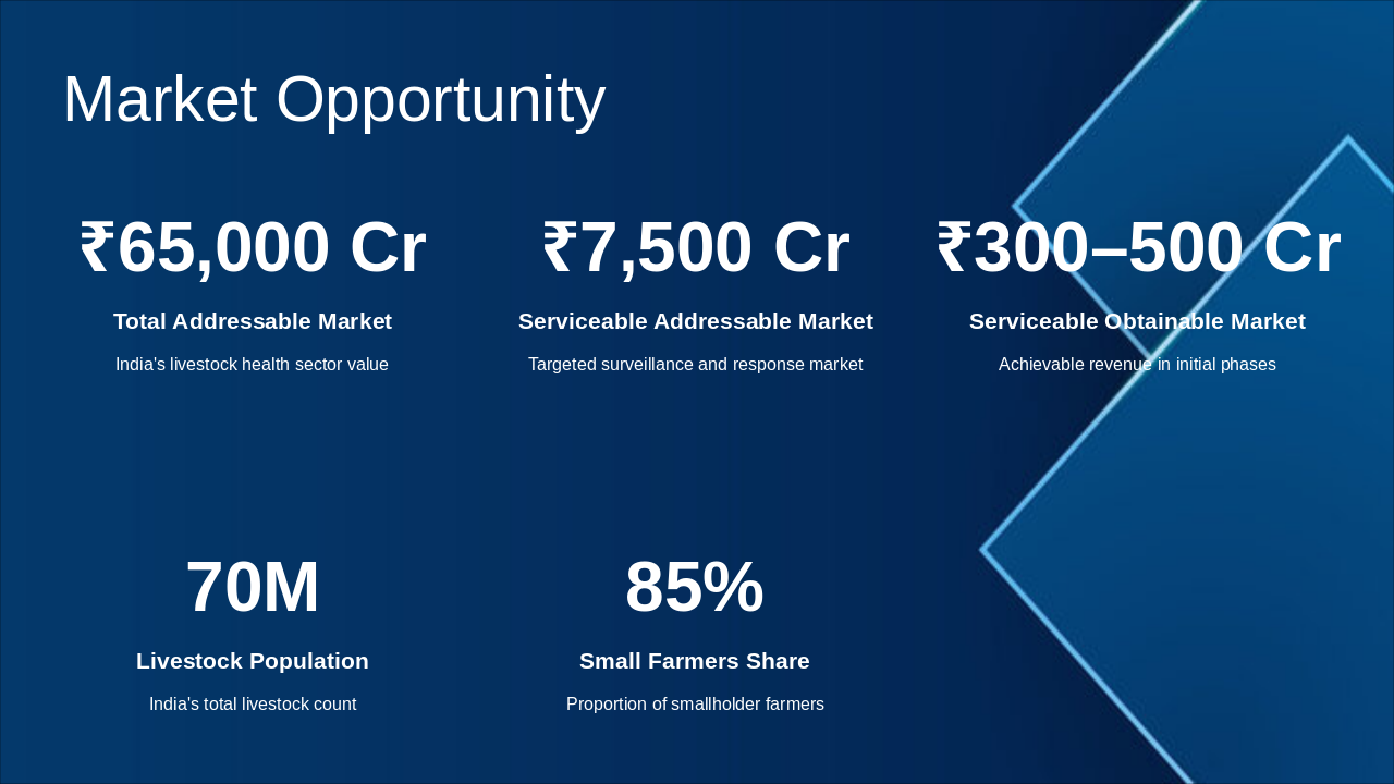 6. Market Opportunity: TAM ₹65,000 Cr, SAM ₹7,500 Cr, SOM ₹300–500 Cr. Demographics: 70M livestock, 85% small farmers.