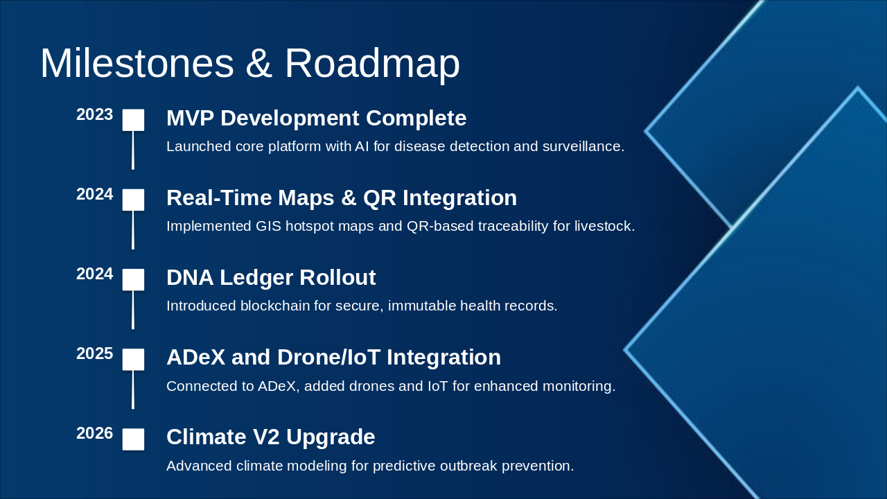 12. Milestones & Roadmap: MVP ready, real-time maps, QR, DNA Ledger. Next: ADeX integration, drone/IoT, climate v2.