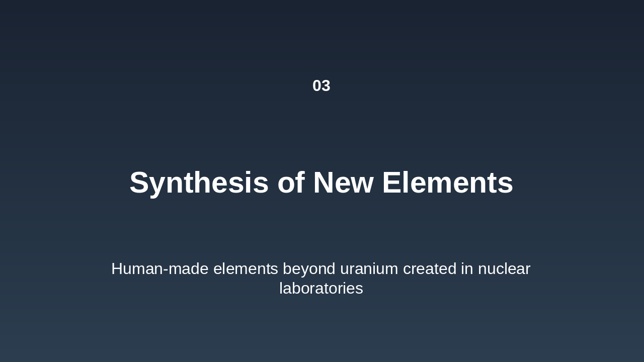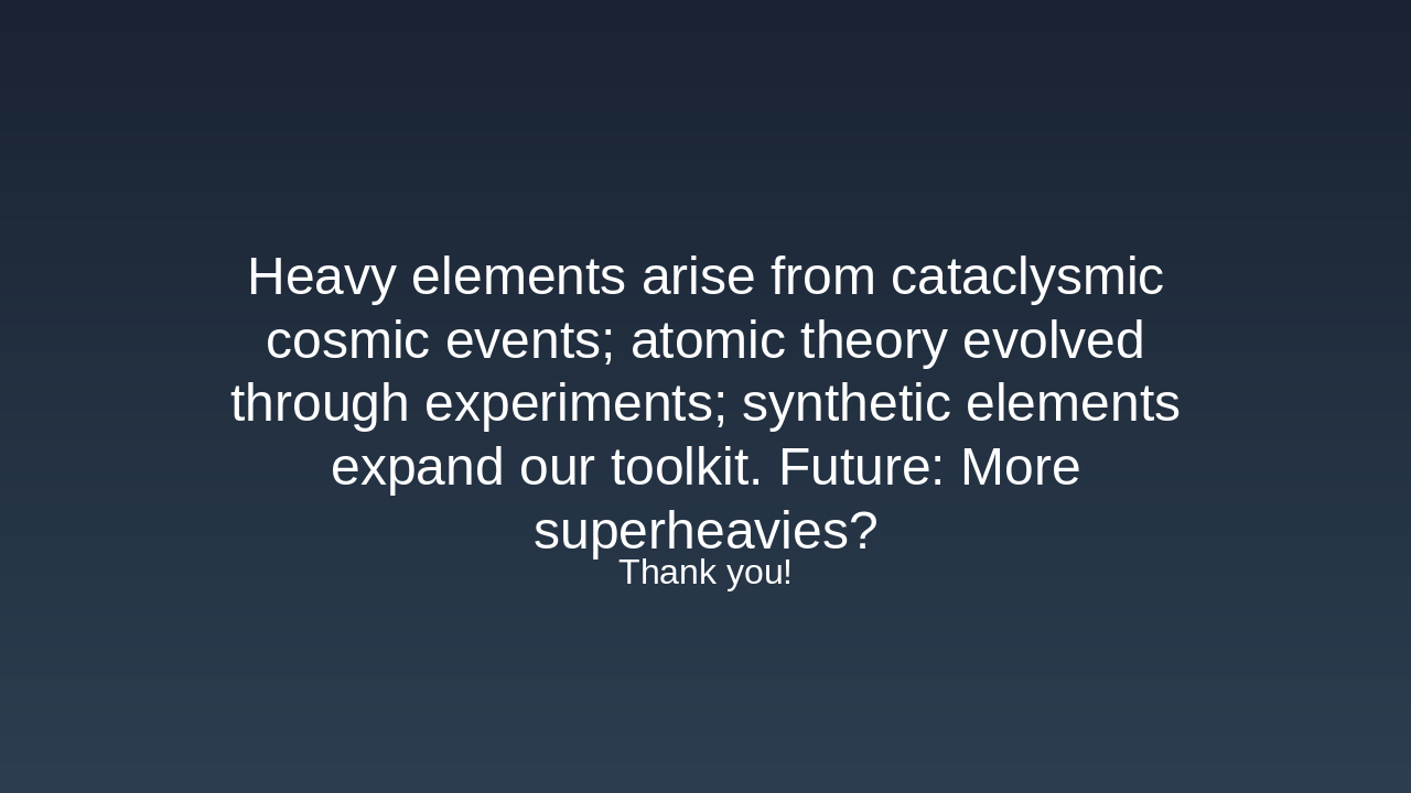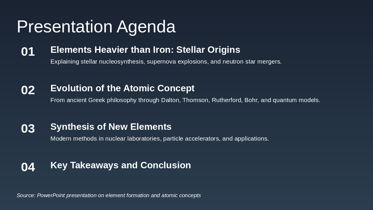 The presentation agenda outlines four main sections: the stellar origins of elements heavier than iron through nucleosynthesis, supernovae, and neutron star mergers; the historical evolution of the atomic concept from ancient Greek ideas to modern quantum models by key scientists like Dalton, Thomson, Rutherford, and Bohr; and modern methods for synthesizing new elements using nuclear labs and particle accelerators, followed by applications.