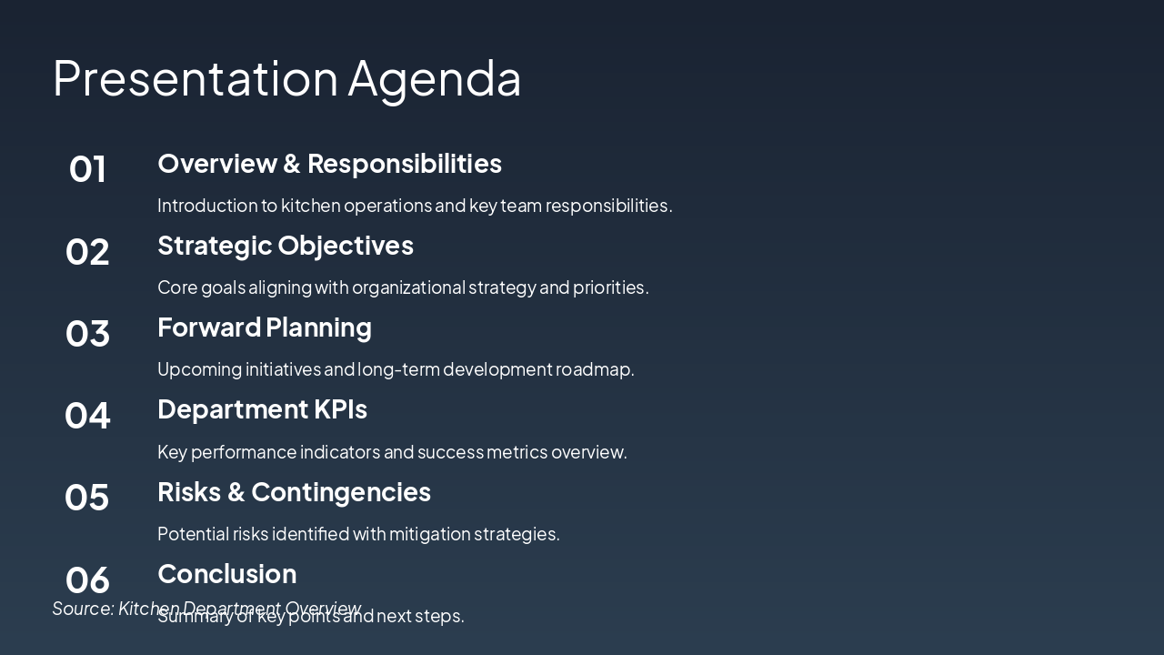 This title slide presents the "Kitchen Department Overview," serving as an introduction to key departmental aspects. The subtitle outlines a review of operations, responsibilities, objectives, KPIs, risks, and forward planning.