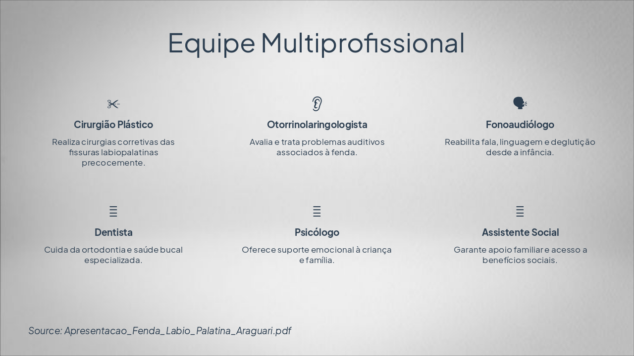 { "features": [ { "icon": "✂️", "heading": "Cirurgião Plástico", "description": "Realiza cirurgias corretivas das fissuras labiopalatinas precocemente." }, { "icon": "👂", "heading": "Otorrinolaringologista", "description": "Avalia e trata problemas auditivos associados à fenda." }, { "icon": "🗣️", "heading": "Fonoaudiólogo", "description": "Reabilita fala, linguagem e deglutição desde a infância." }, { "icon": "🦷", "heading": "Dentista", "description": "Cuida da ortodontia e saúde bucal especializada." }, { "icon": "🧠", "heading": "Psicólogo", "description": "Oferece suporte emocional à criança e família." }, { "icon": "👥", "heading": "Assistente Social", "description": "Garante apoio familiar e acesso a benefícios sociais." } ] }