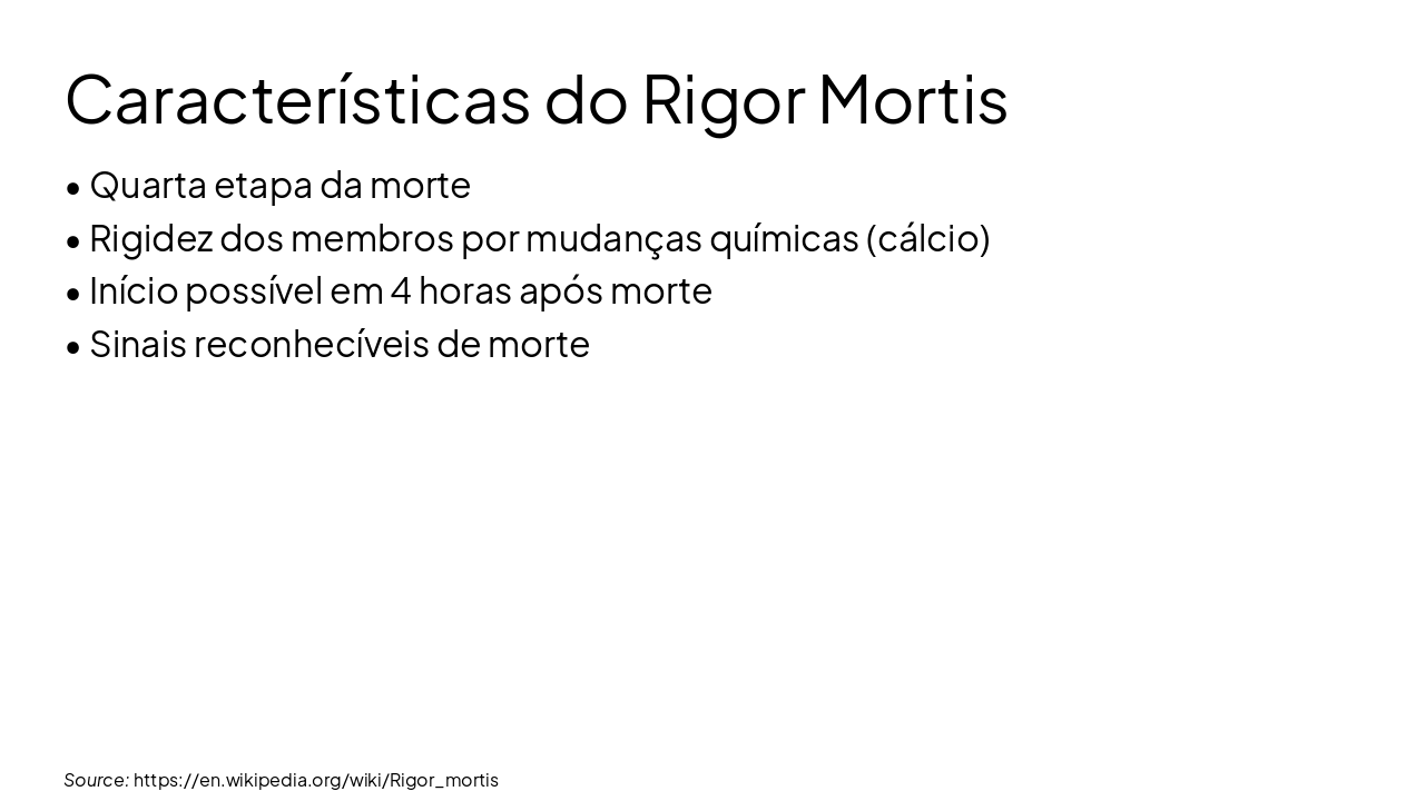 > Rigor mortis (...) é a quarta etapa da morte. É um dos sinais reconhecíveis de morte, caracterizado pela rigidez dos membros do cadáver causada por mudanças químicas nos músculos postmortem (principalmente cálcio). Em humanos, pode ocorrer assim que quatro horas após a morte.