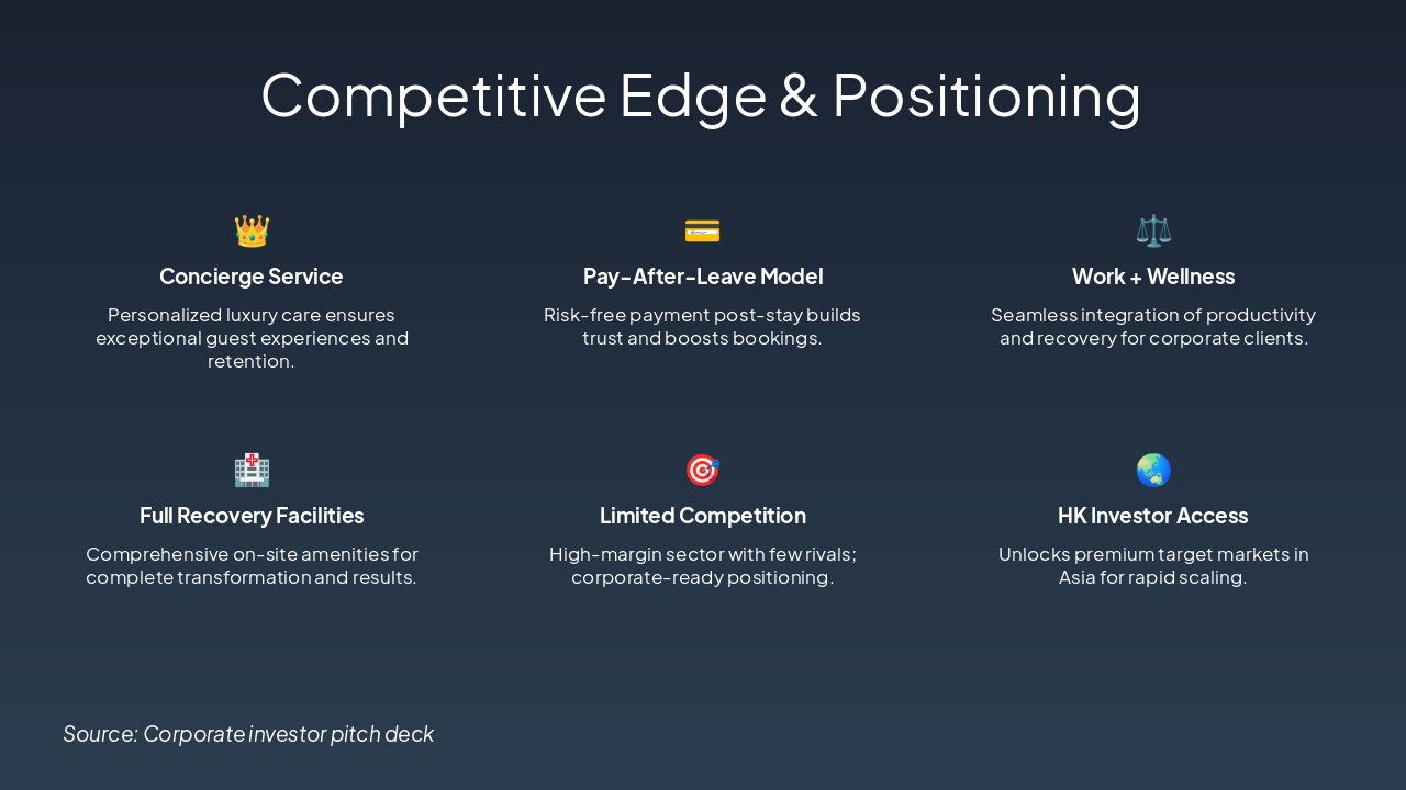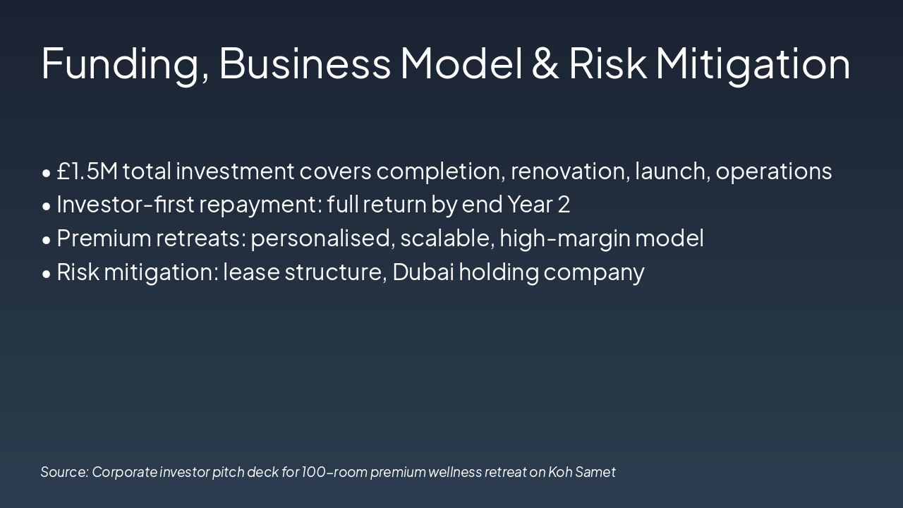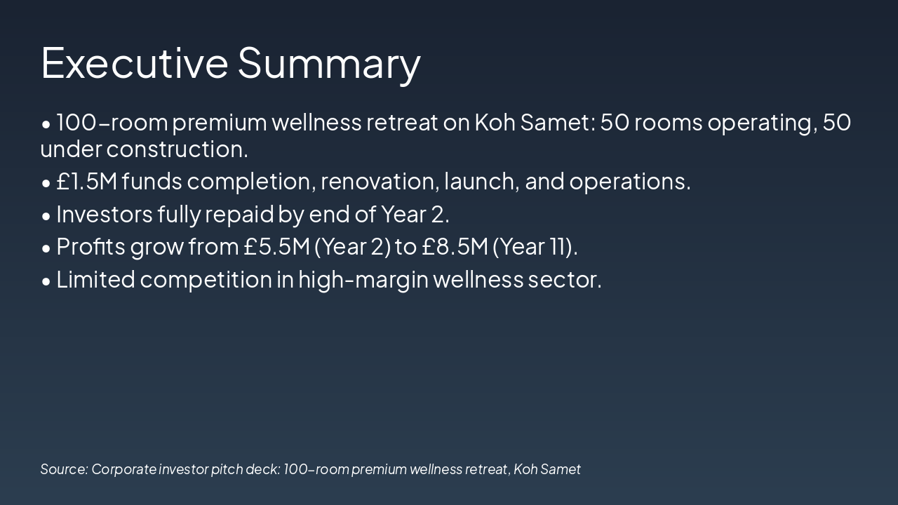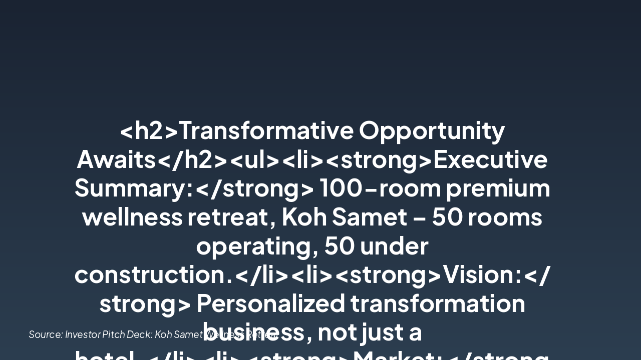 <h2>Transformative Opportunity Awaits</h2><ul><li><strong>Executive Summary:</strong> 100-room premium wellness retreat, Koh Samet – 50 rooms operating, 50 under construction.</li><li><strong>Vision:</strong> Personalized transformation business, not just a hotel.</li><li><strong>Market:</strong> Explosive wellness growth, limited competition, luxury margins.</li><li><strong>Funding:</strong> £1.5M for completion, renovation, launch, operations.</li><li><strong>Returns:</strong> Investors repaid by end Year 2; £4.2M founder profit Years 3-7. Profits: £5.5M (Y2) to £8.5M (Y11).</li><li><strong>Risk Mitigation:</strong> Investor-first repayment, lease structure, Dubai holding.</li><li><strong>Edge:</strong> Concierge, pay-after-leave, work+wellness, full recovery.</li></ul><p><em>This is not a hotel — it’s a transformation business built for lasting wellbeing and luxury margins.</em></p><h3>Invest Today</h3><p>Contact us to secure your stake and drive strong returns.</p>