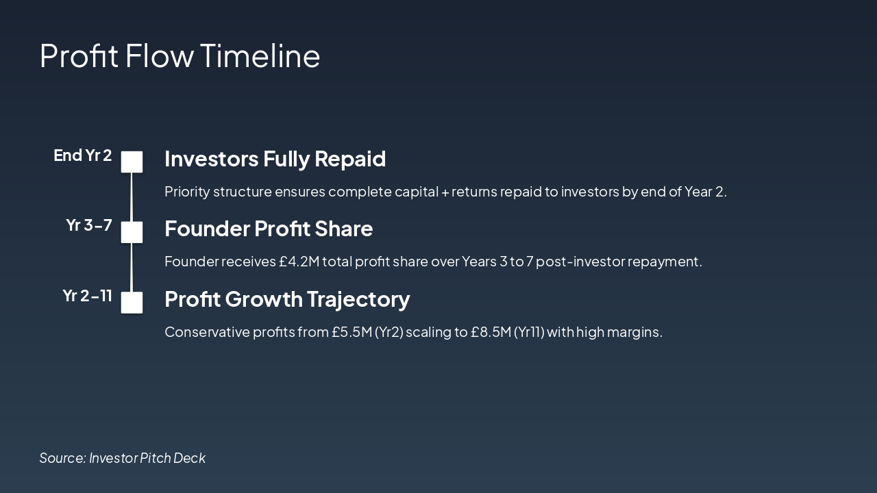 Summarize key points: £1.5M investment for 100-room premium retreat (50 operating, 50 under construction). Repay investors by Year 2, strong profits £5.5M+ from Year 2. Low risk, high margins in booming wellness market. Invite questions and next steps.